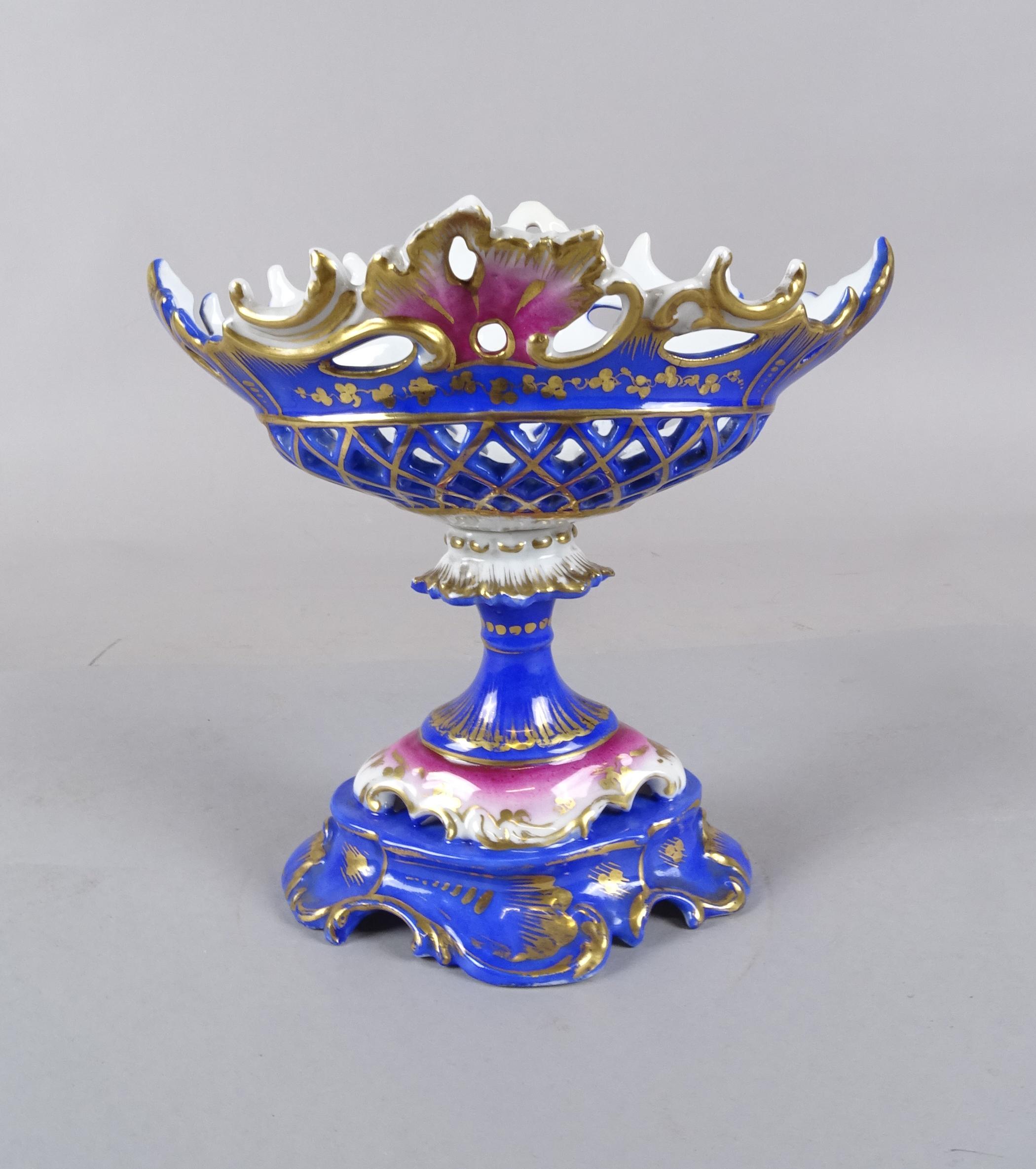 Céramique: Milieu de table / coupe sur pied de style Louis-Philippe en porcelaine ajourée de Paris rehauts d'or fond bleu H: 20cm