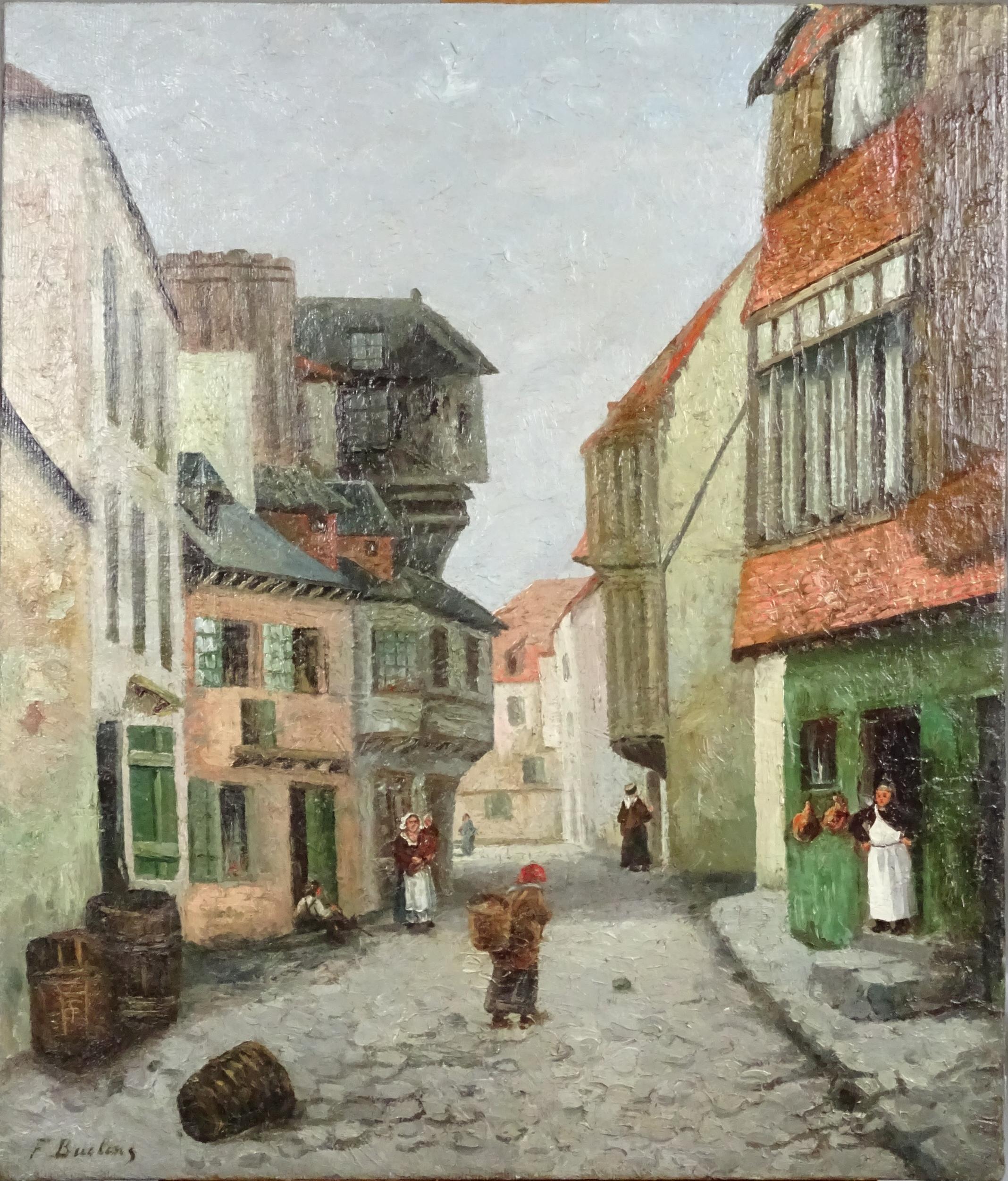 Tableau HST -Rue animée- signé *BUELENS F.* (Michel Felix) (Etterbeek 1850- Ostende, 1921) 81x70cm s/s cadre