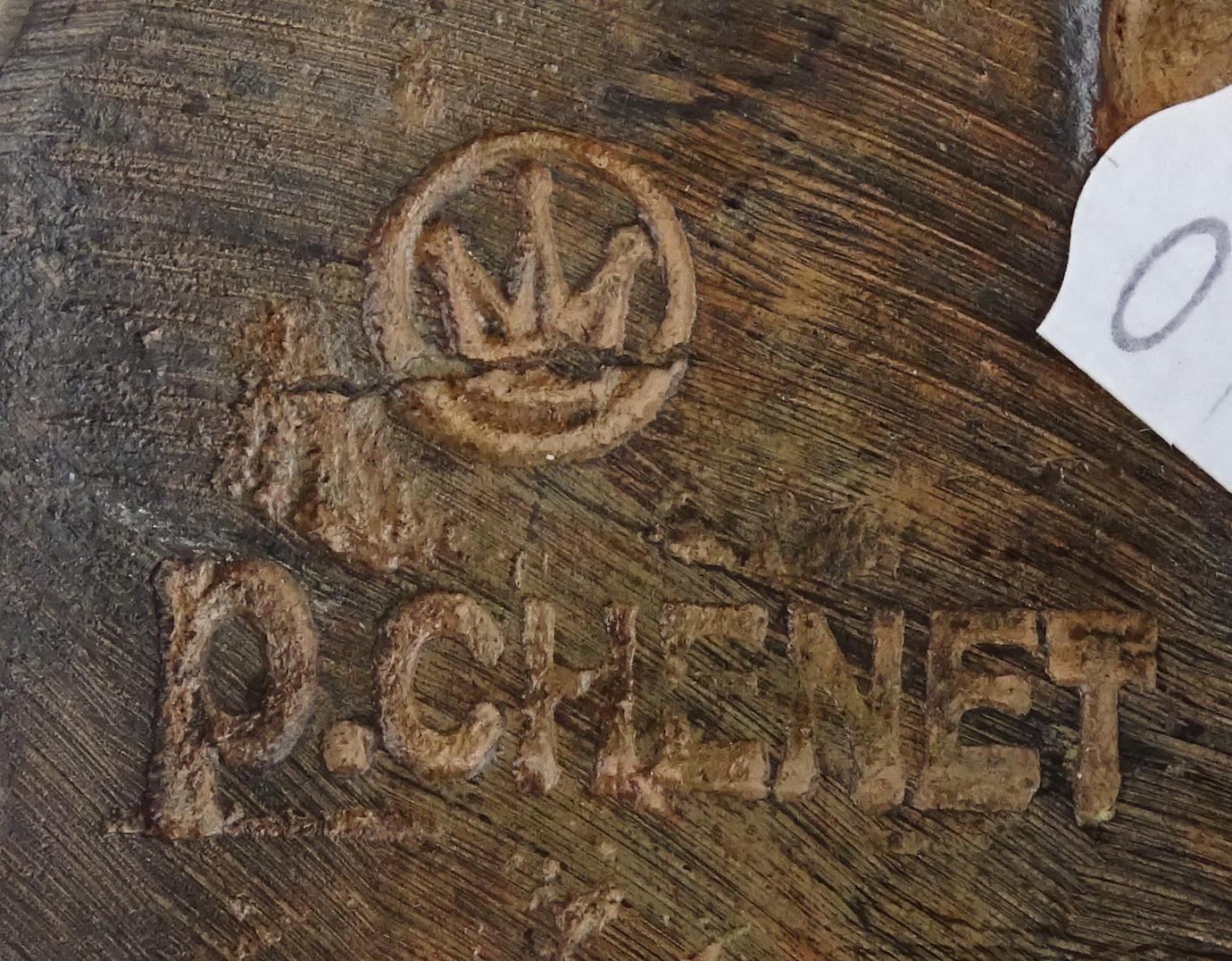 Sculpture: Bronze à patine brune -Chienne de chasse et ses petits- signé *CHENET P.* (Pierre) (français né vers 1922,) 7x16,5x8cm
