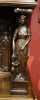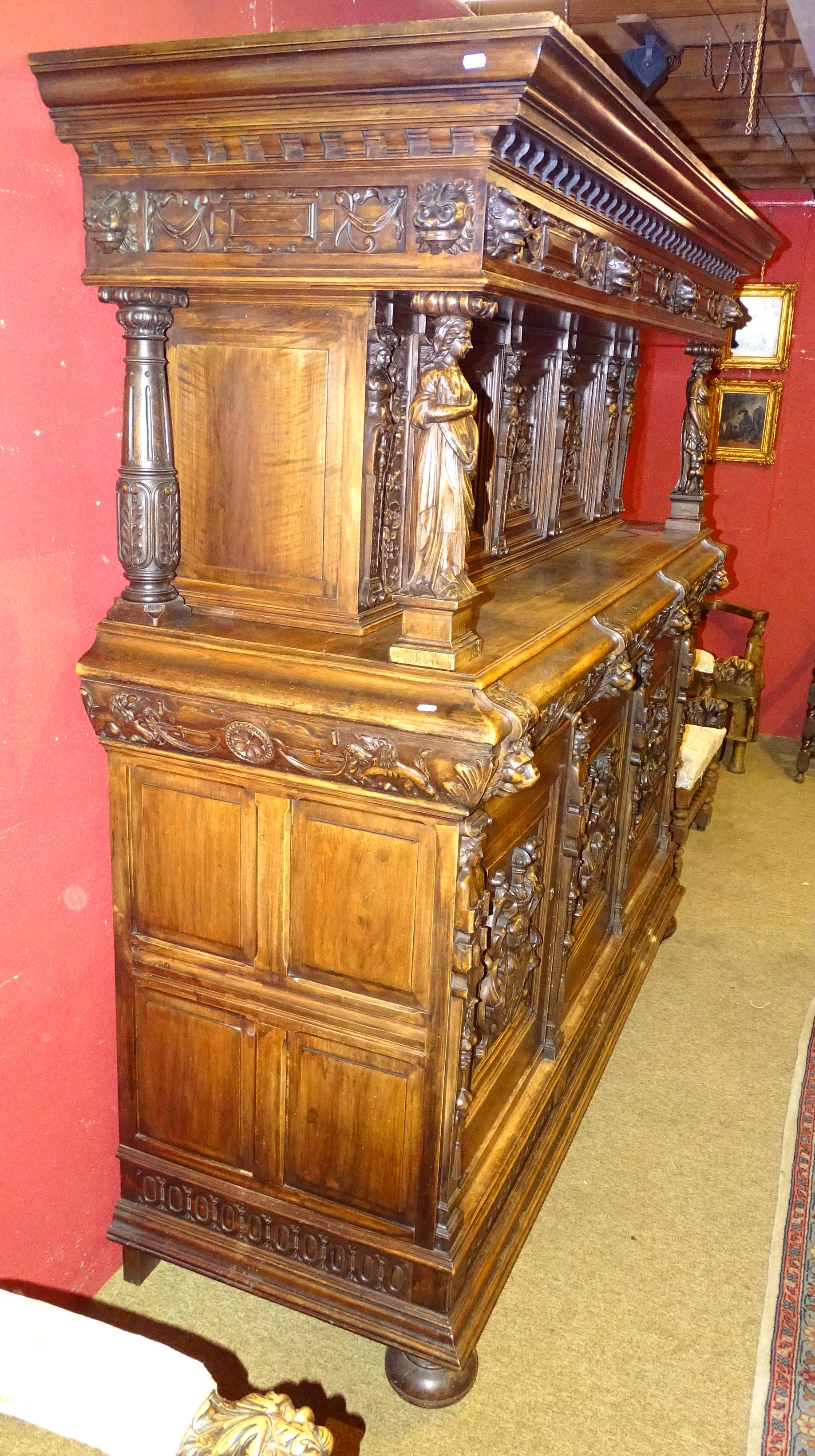 Meuble: Bahut Néo-Renaissance en noyer sculpté 2e moitié 19eS scène galante bas 3P 3T dessus 2 P montants cariatides et colonnes 205x202x70cm