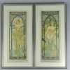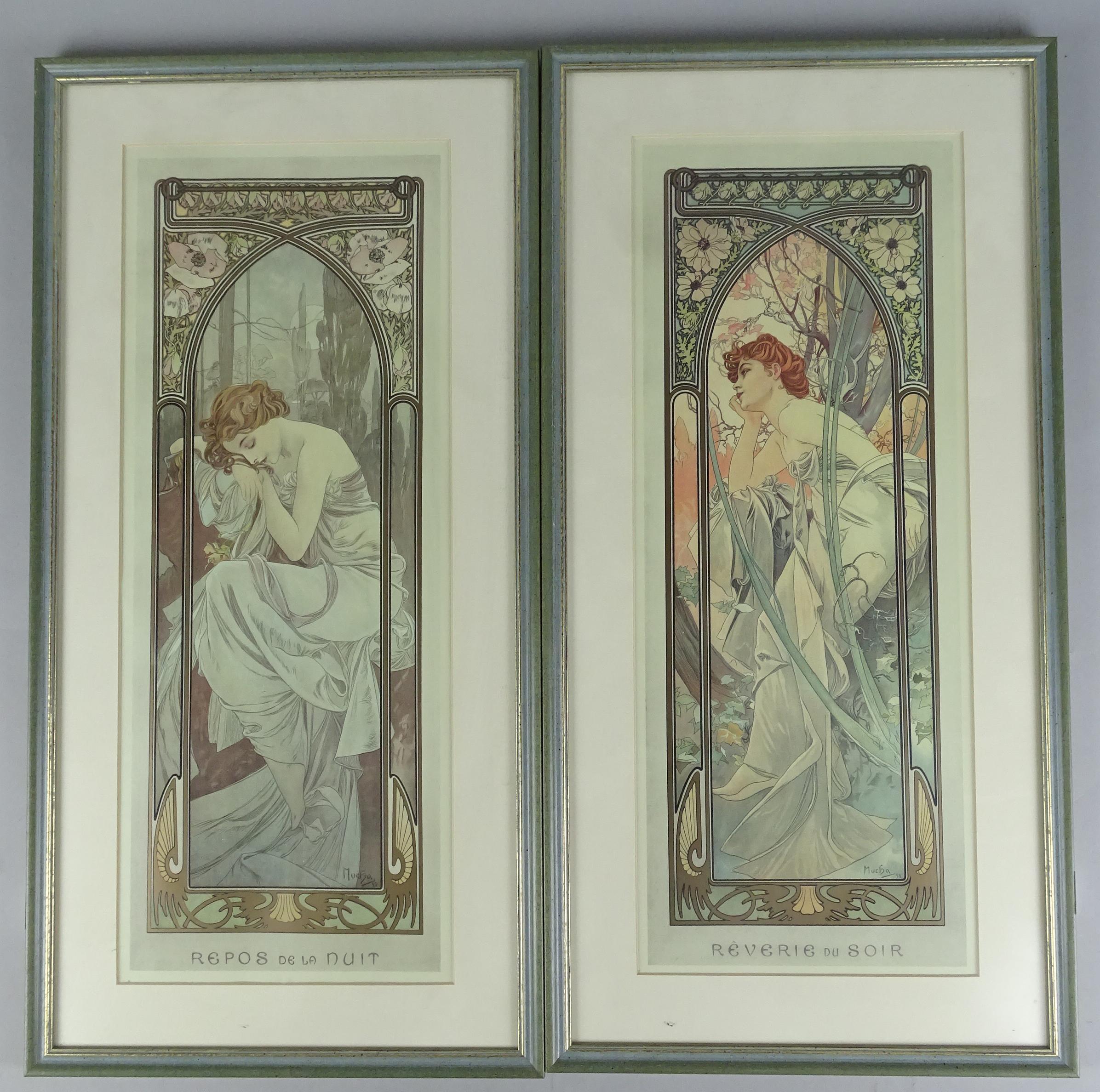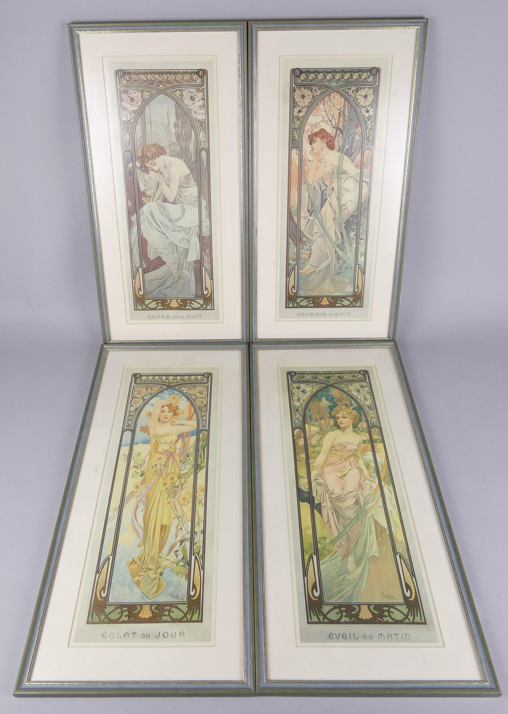 Estampe: chromo/offset (4pcs) -Les heures du jour- daté et signé dans la planche 99 d'après *MUCHA A.* (Alphonse) (1860, 1939) 46,5x17,5cm cadre sous plexi