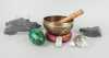 Objet : Bol tibétain gravé a/mailloche +Oeuf en malachite +Pendentif argent et nacre gravée Georgescu Gregory +boule de cristal +2 fossiles de plantes