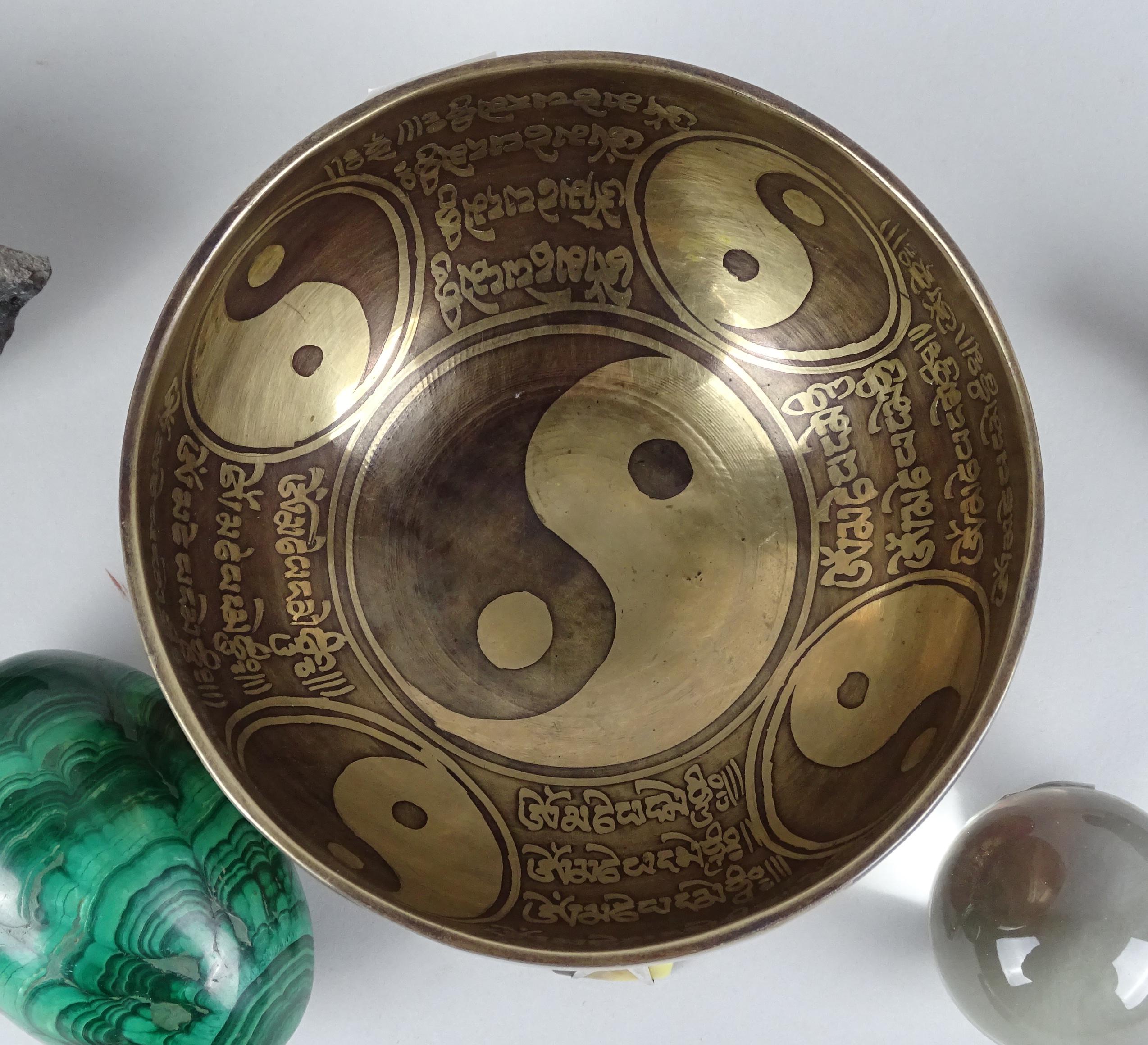 Objet: Bol tibétain gravé a/mailloche D:14,5 +Oeuf en malachite H:9 +Pendentif argent et nacre gravée Georgescu Gregory H:4,5cm +boule de cristal +2 fossiles de plantes