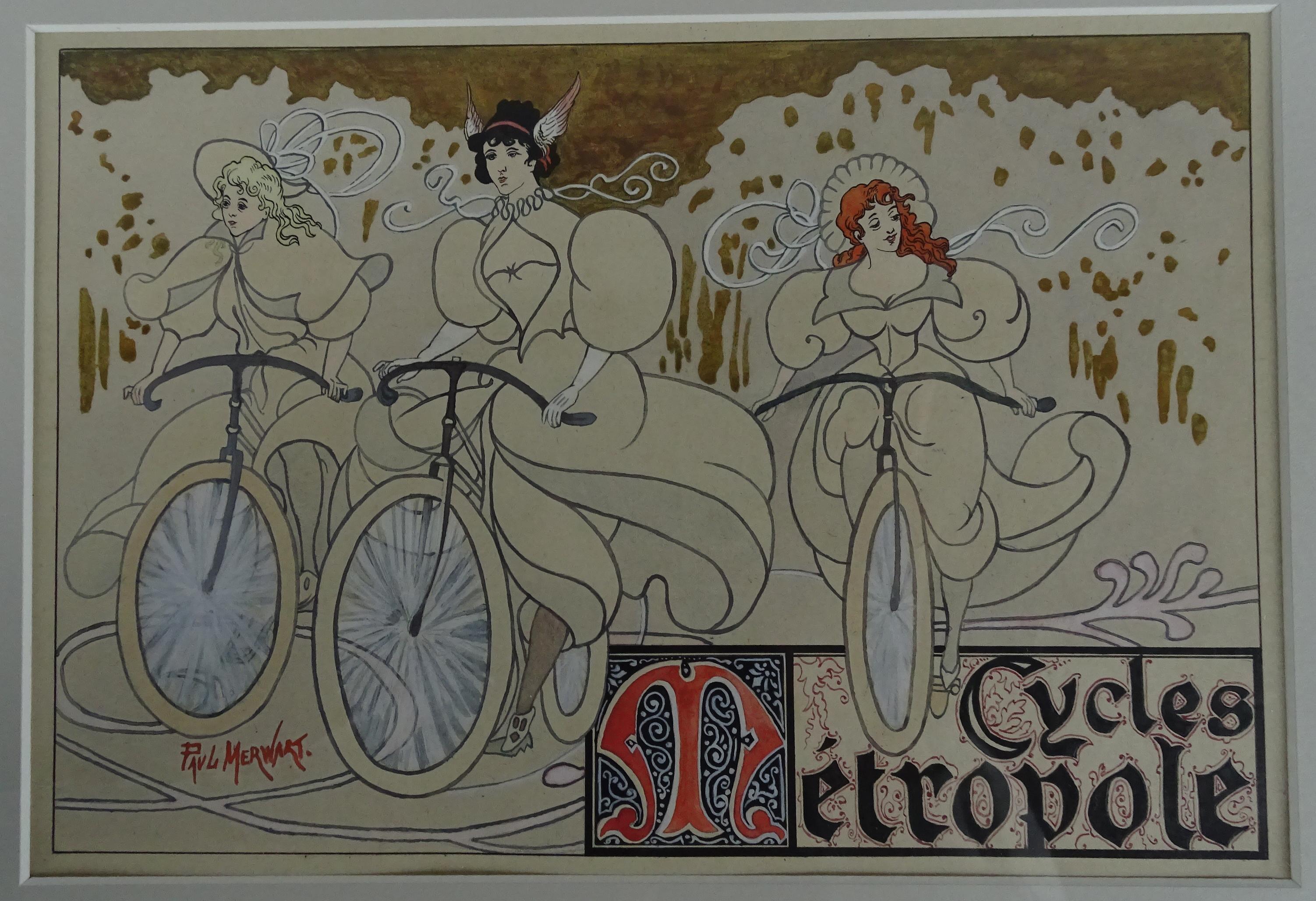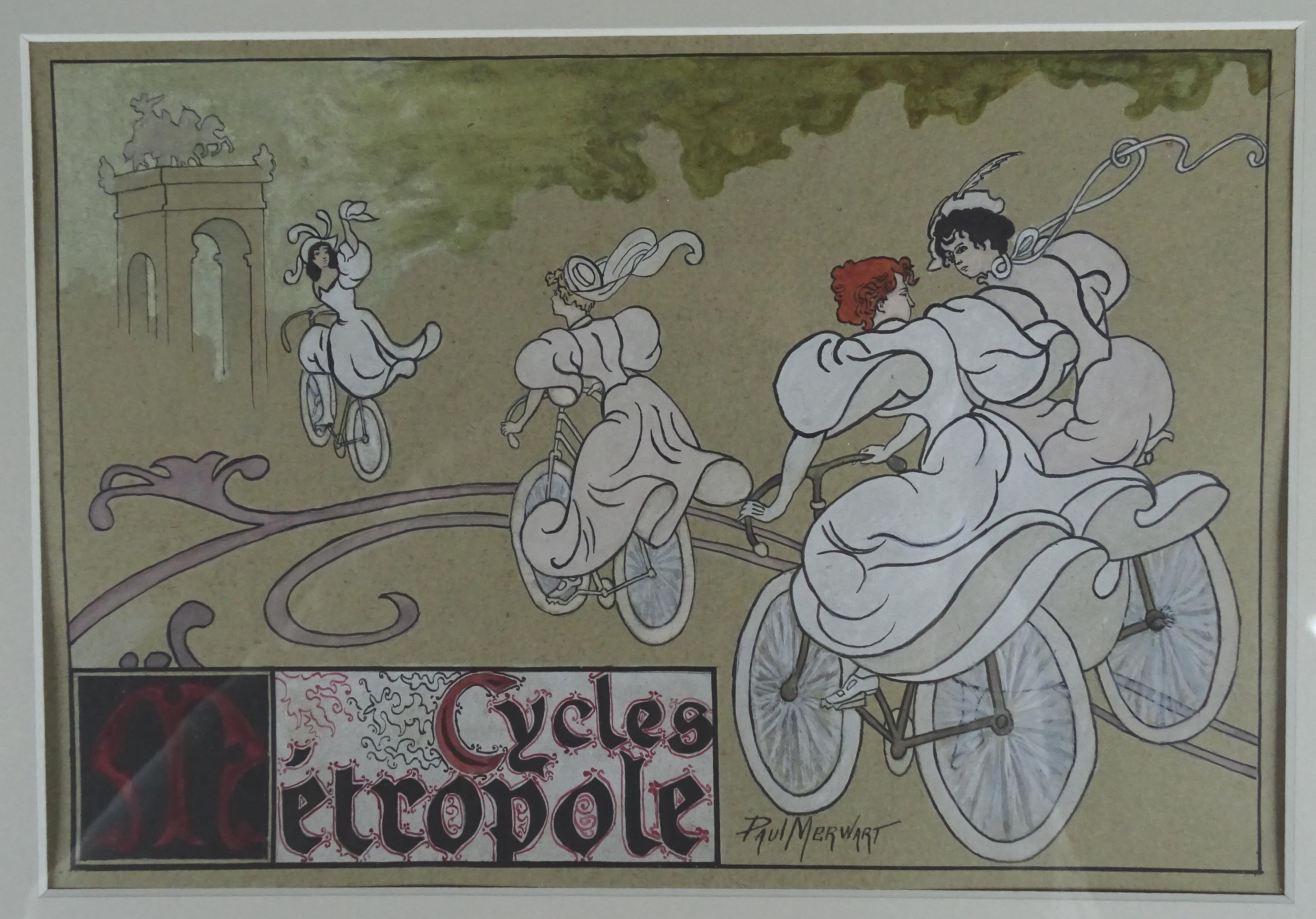 Tableau: dessins (2pcs) -Projet d'affiche Cycles Métropole- signé *MERWART P.* (Paul) (1955, 1902) 18x26cm cadre noir sous verre