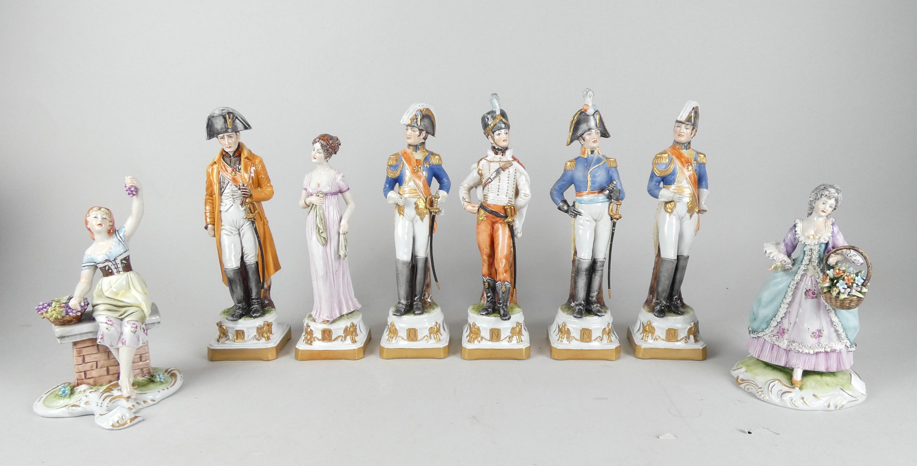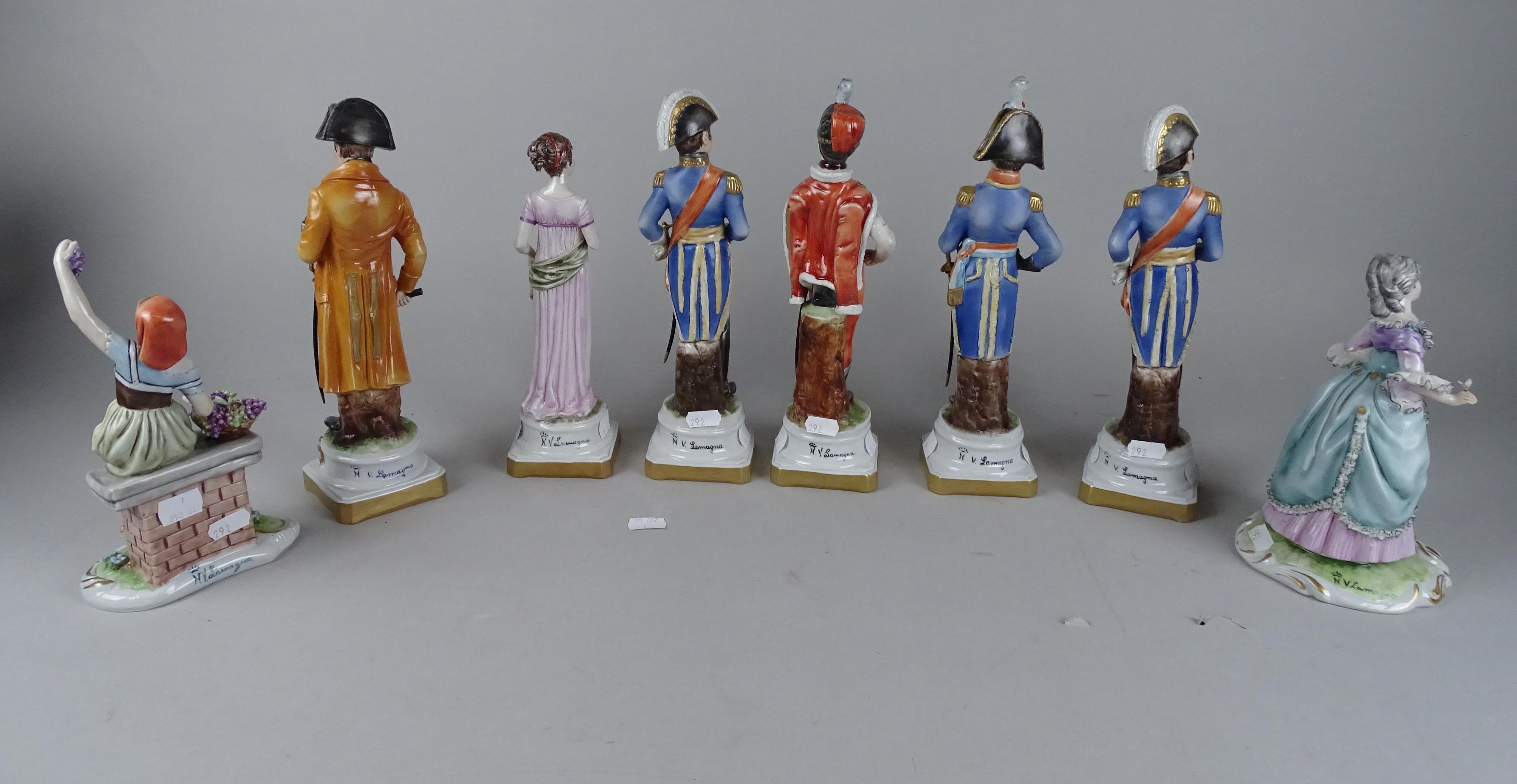 Céramique : Sujets en porcelaine (8pcs) cachet Capodimonte signé LAMAGNA V. - Napoléon - , 4 soldats napoléoniens (mq 1 sabre) et 3 femmes