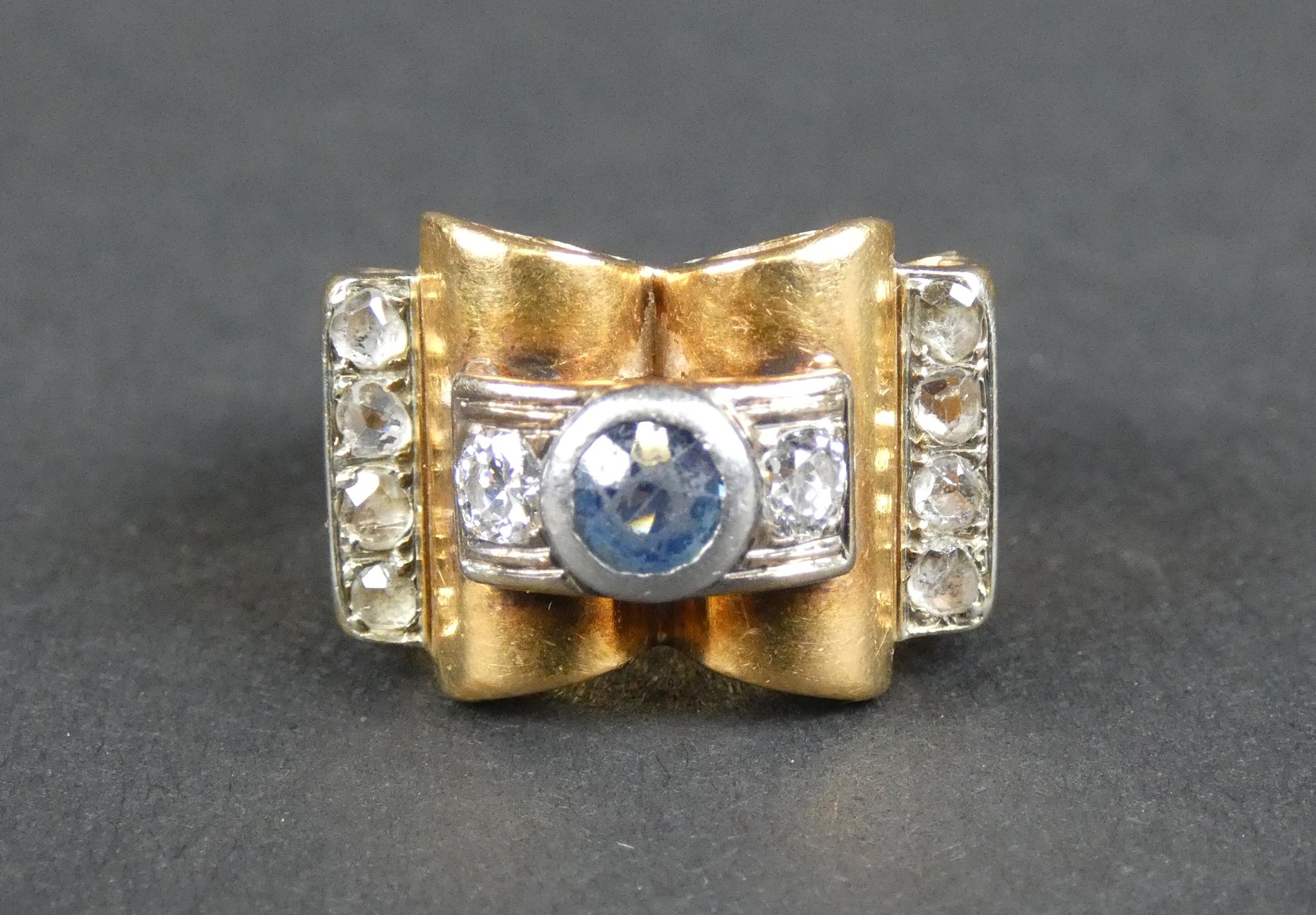 Bijou: Bague ART-DECO en or jaune 18K sertie d'un saphir (usures) et de diamants dont 2 principaux d'env. 0,10cts P: 8,3g TDD: 49