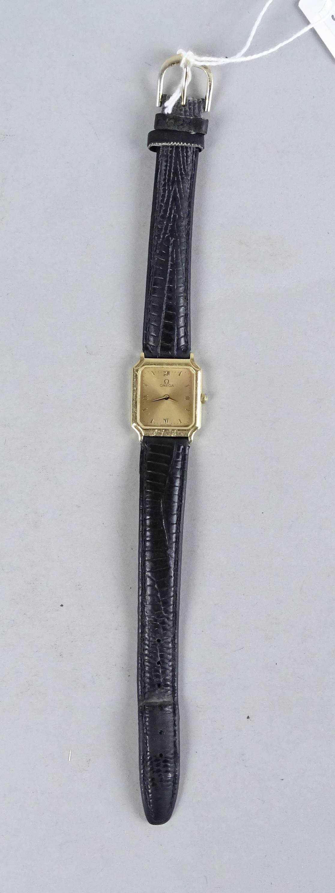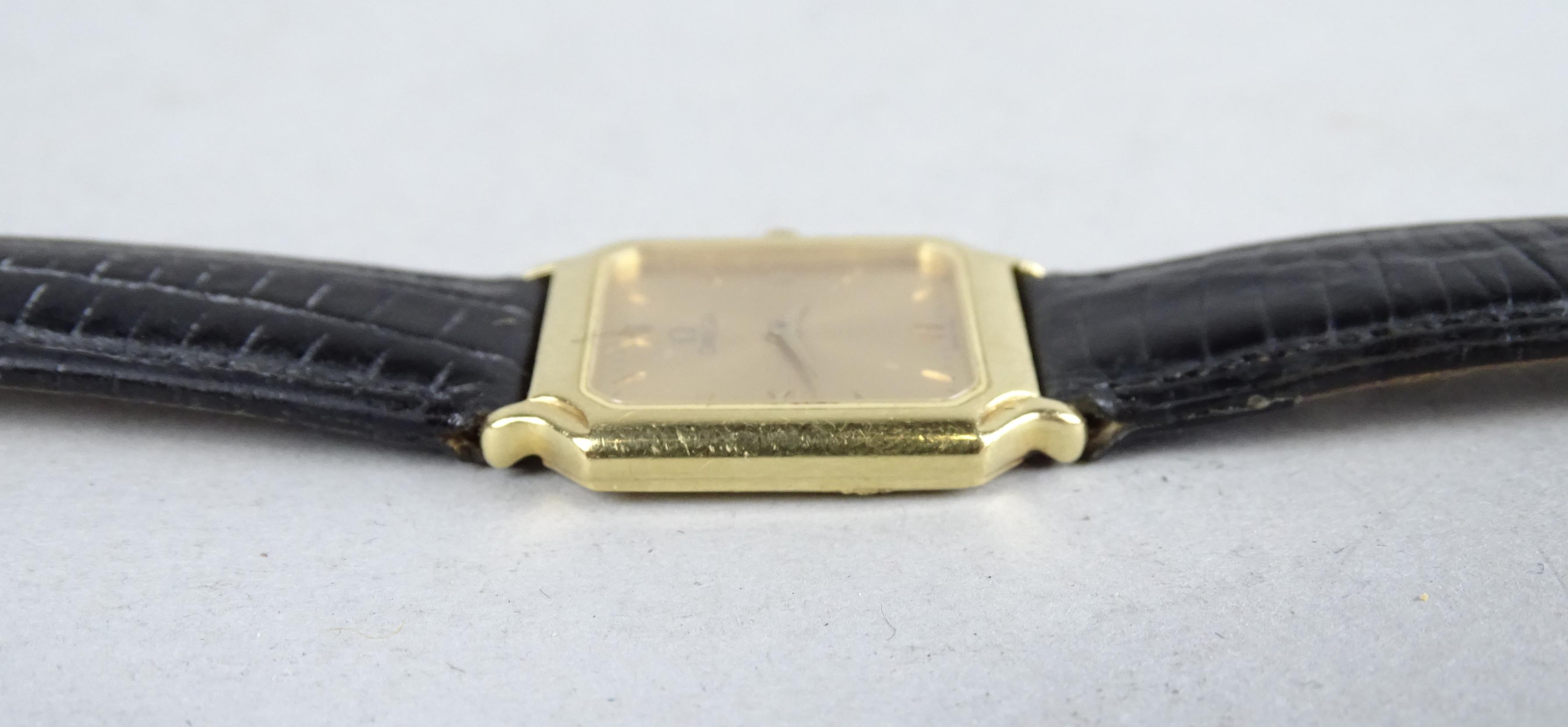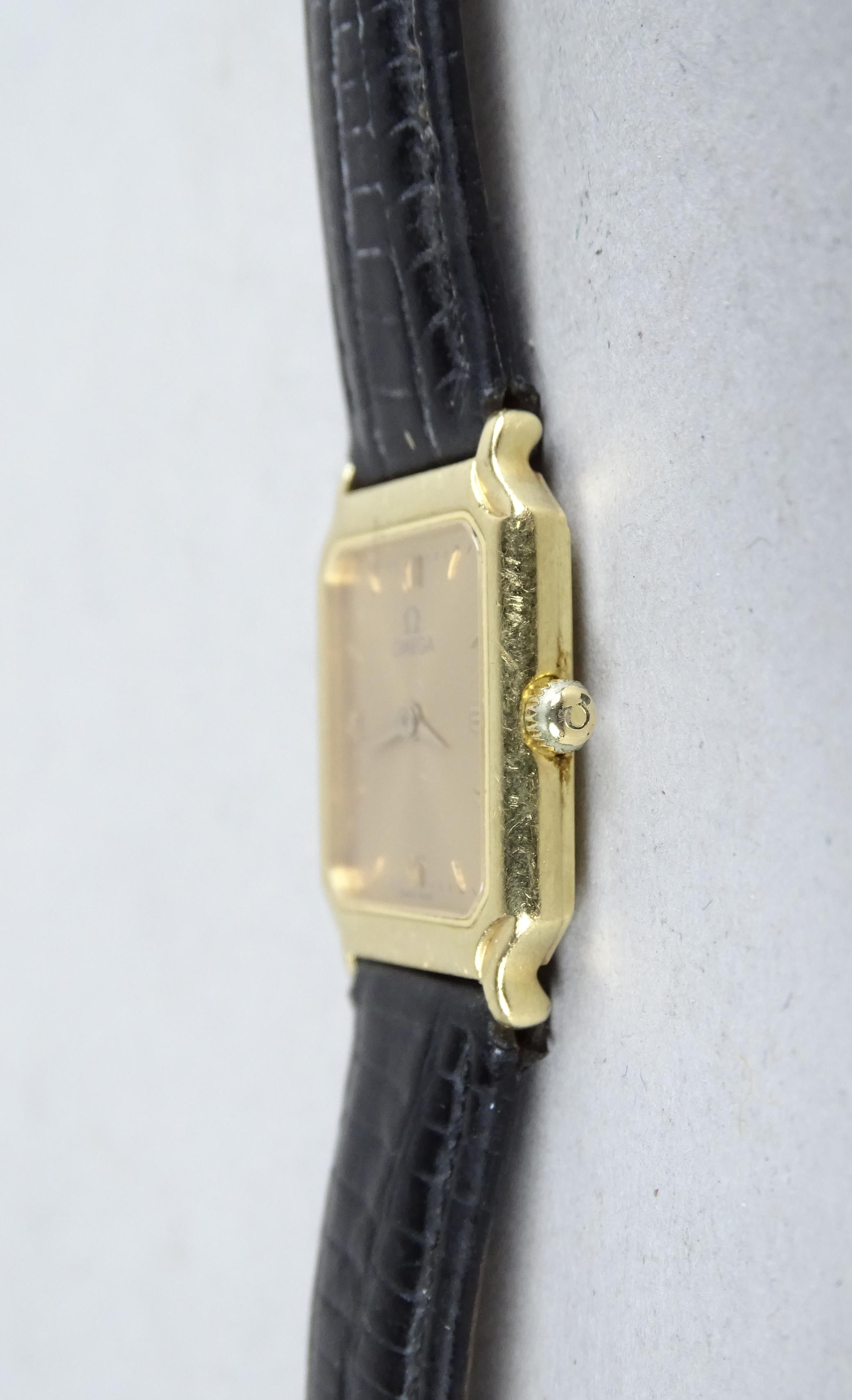 Bijou: Montre bracelet de dame OMEGA De Ville extra-plate en of 18K mvt à quartz (en état) bracelet cuir rapporté 26x20mm PTot:16,5g