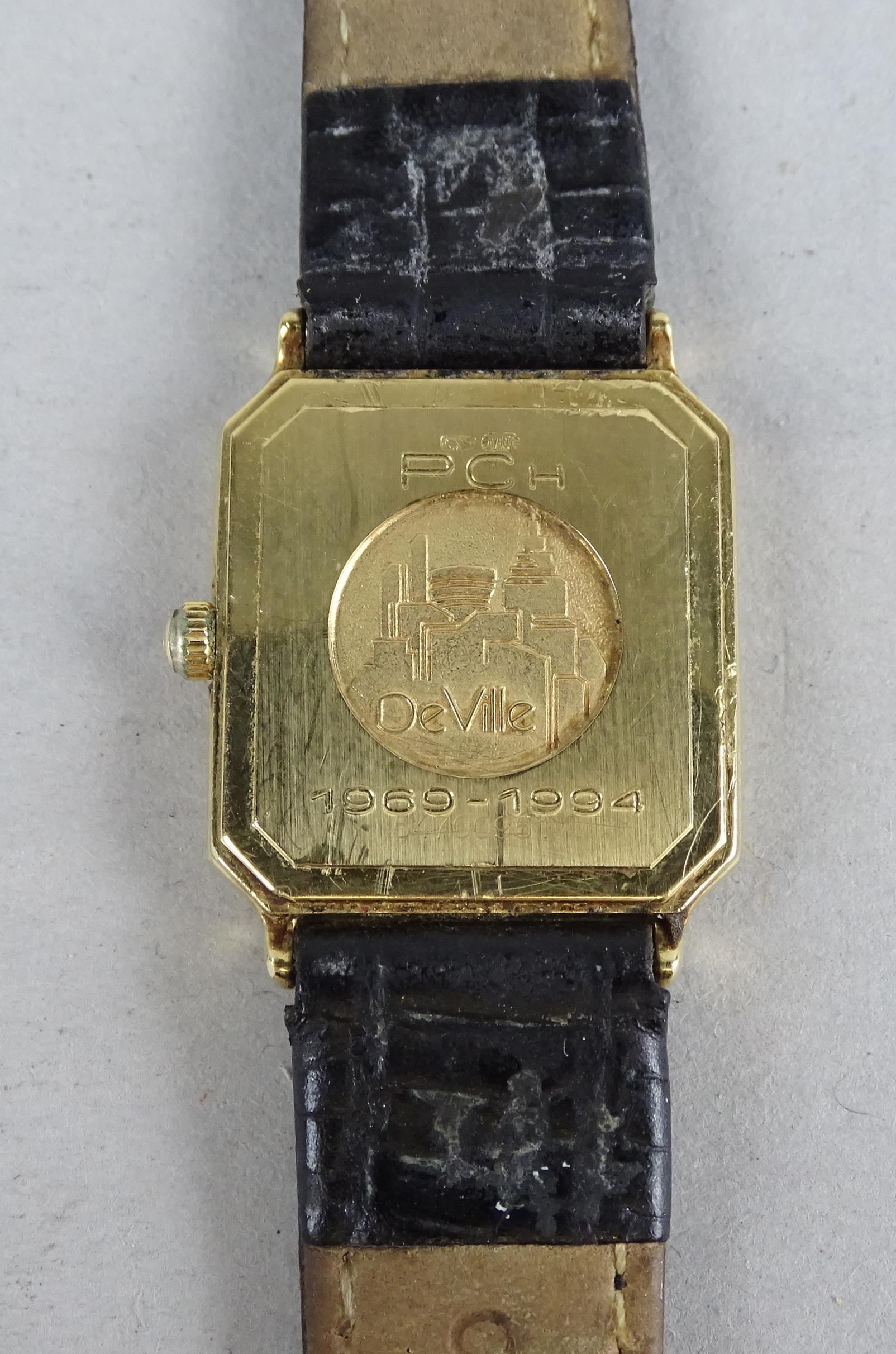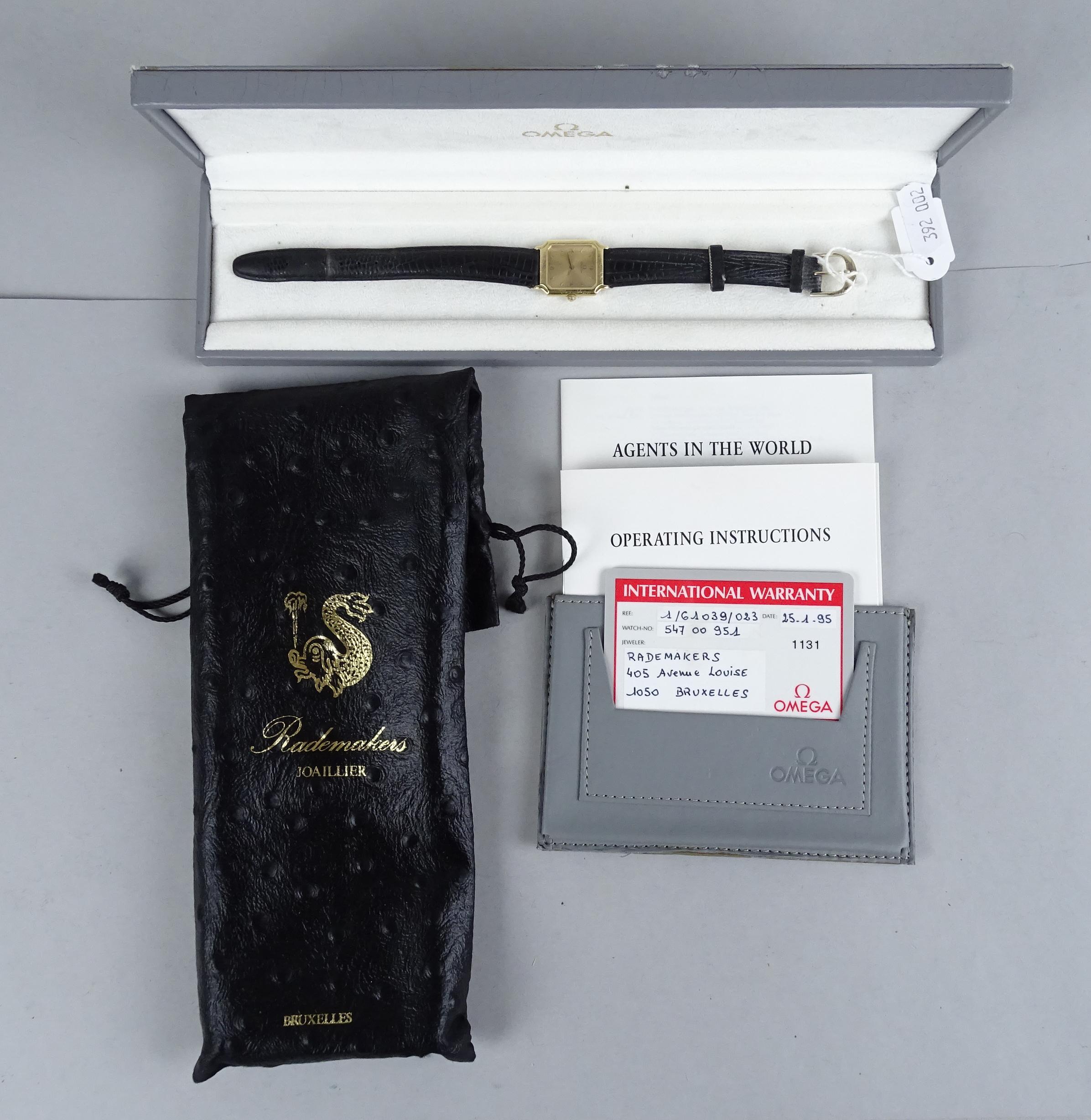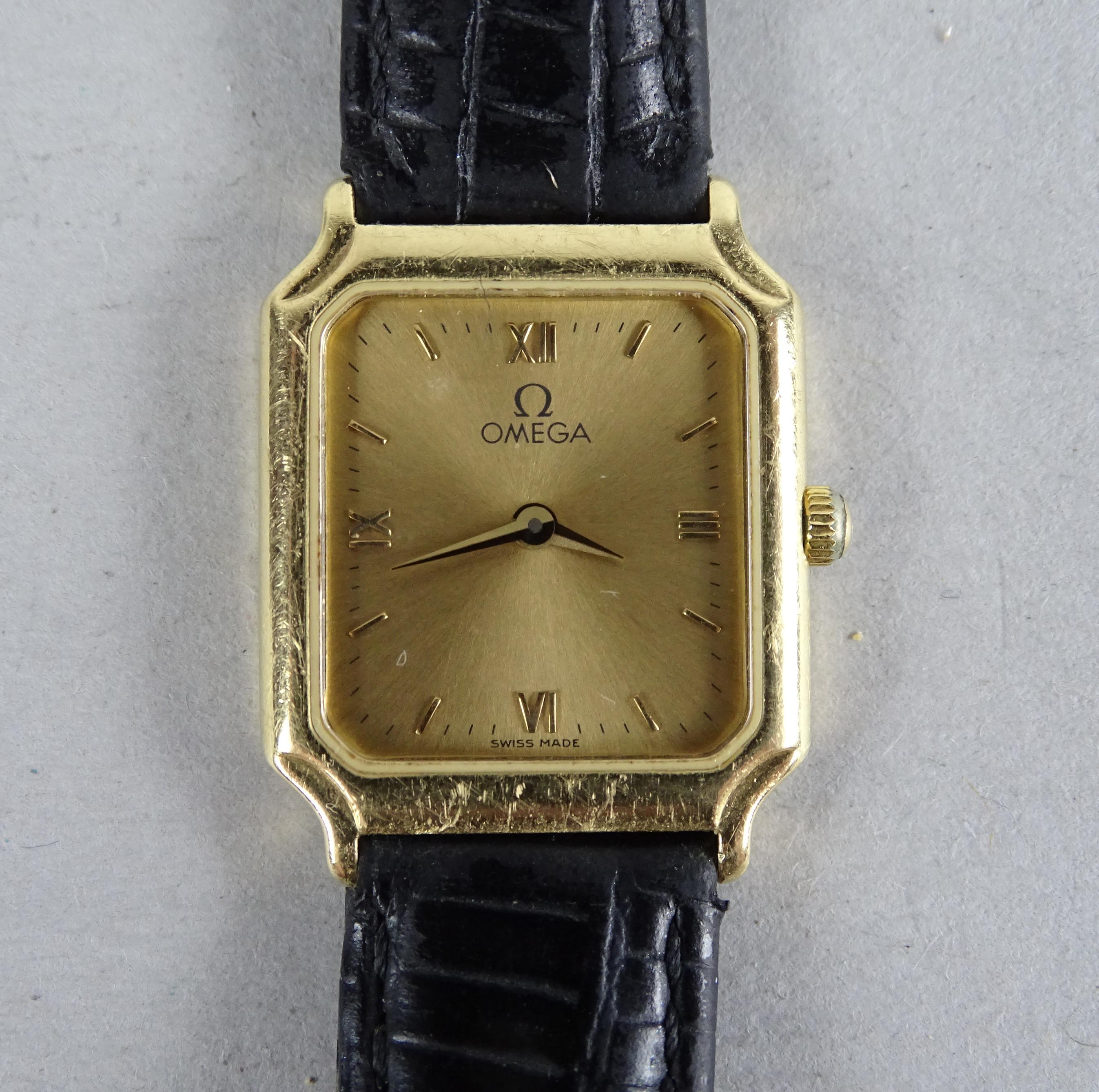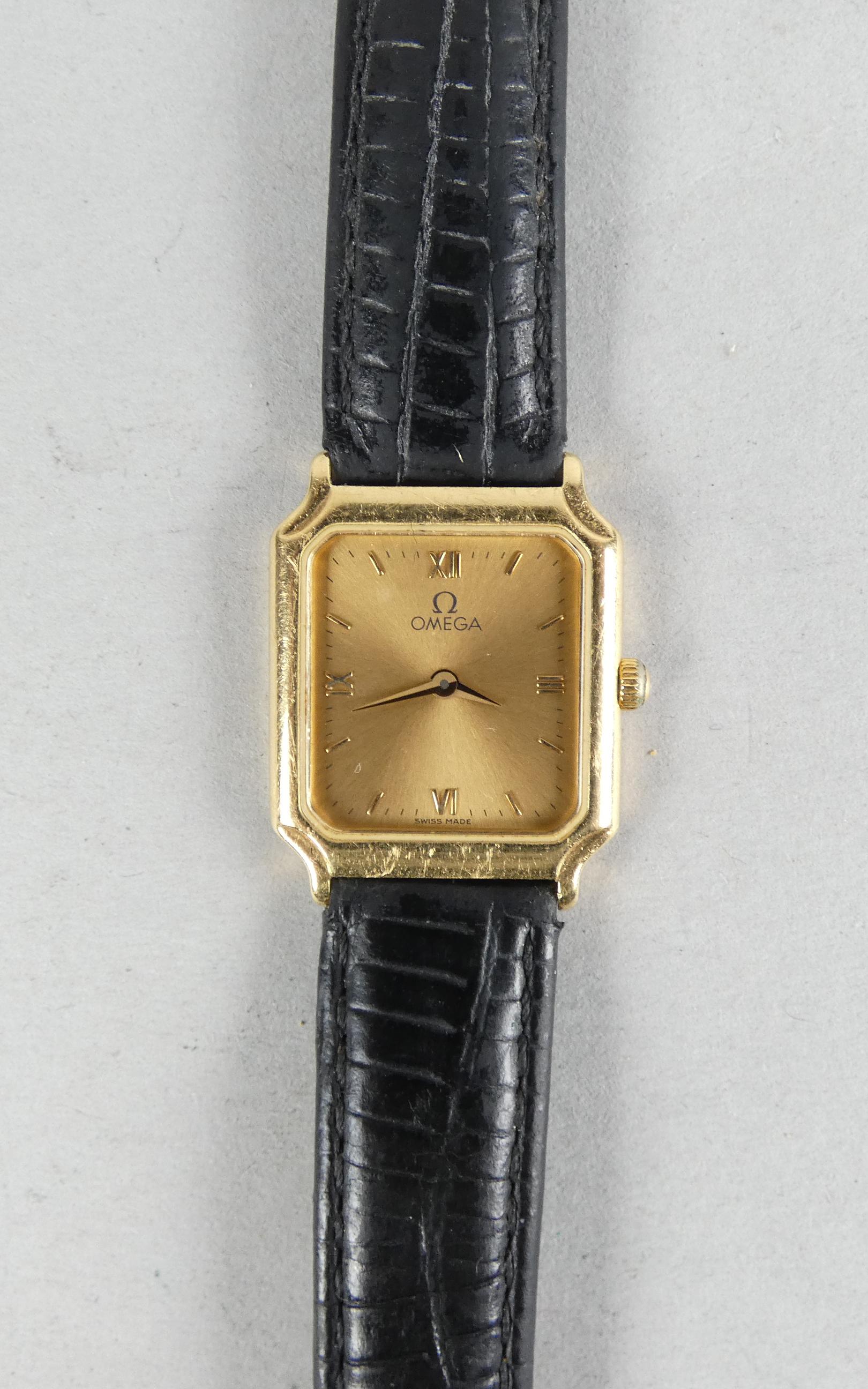 Bijou: Montre bracelet de dame OMEGA De Ville extra-plate en of 18K mvt à quartz (en état) bracelet cuir rapporté 26x20mm PTot:16,5g