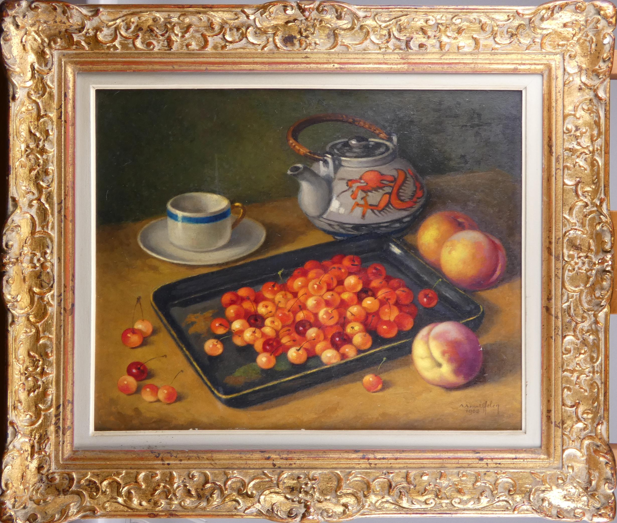 Tableau HSP -Nature morte aux cerises- daté 1968 signé *VAN UFFELEN A.* (Alphonse) (1895, 1983) 41x50cm cadre doré de style