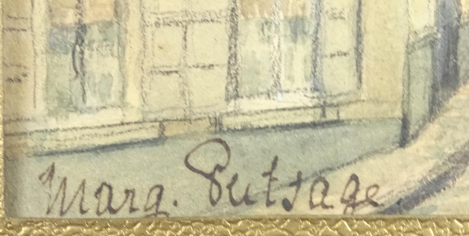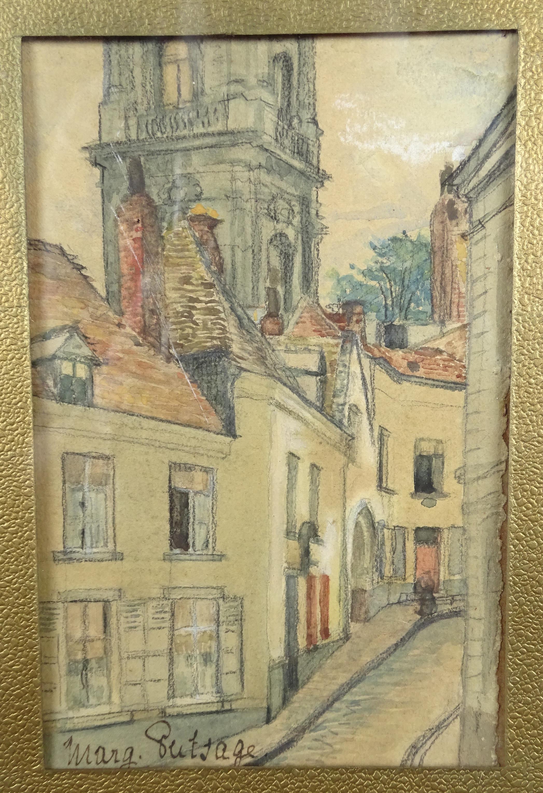 Tableau: aquarelle -Vue de la rue Cronque sur le beffroi de Mons- signé *PUTSAGE M.* (Marguerite) (1868, 1946) 13x9cm cadre bois s/v