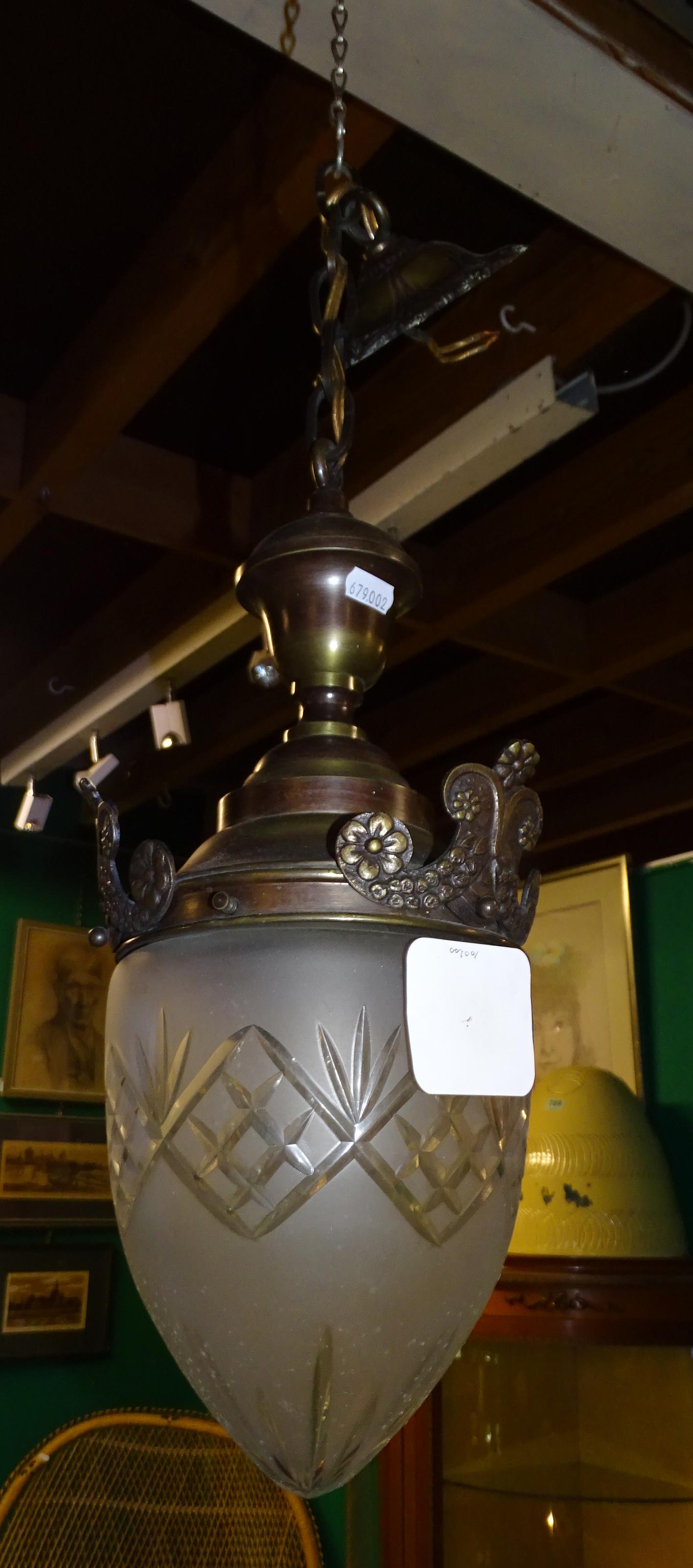 Luminaire: Lanterne goutte d'eau fin 19e-début 20eS en cuivre doré et cristal taillé maté H:60cm