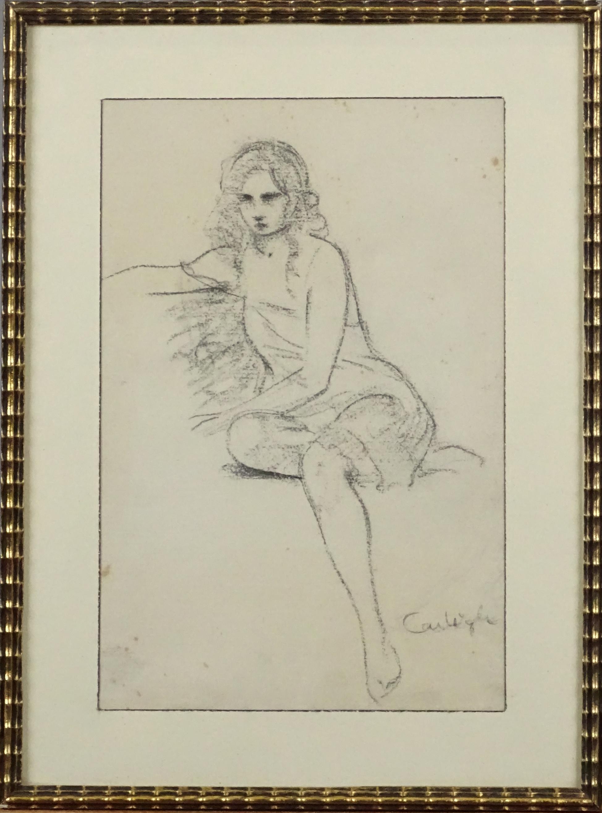 Tableau: dessin fusain -femme assise- signé *CARLEGLE C.* (Charles Emile) (1877, 1937) 25,5x17cm cadre doré s/v