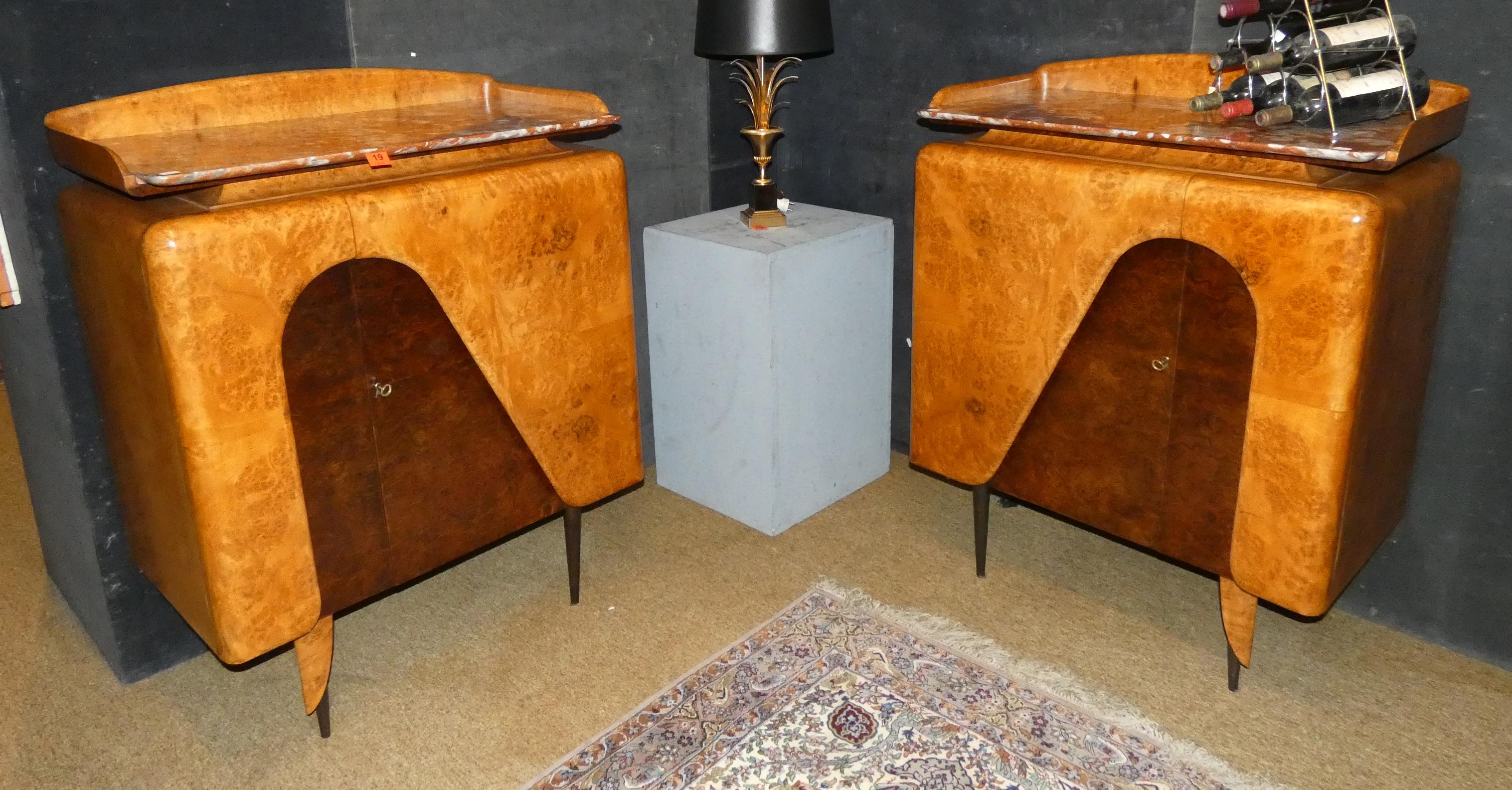 Meuble: Rare paire de buffets Art déco dont un intérieur Bar (traces d'usages) en loupe 2 portes dessus marbre rose dans le goût du mobilier de paquebot/hôtel 116x90x51cm