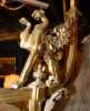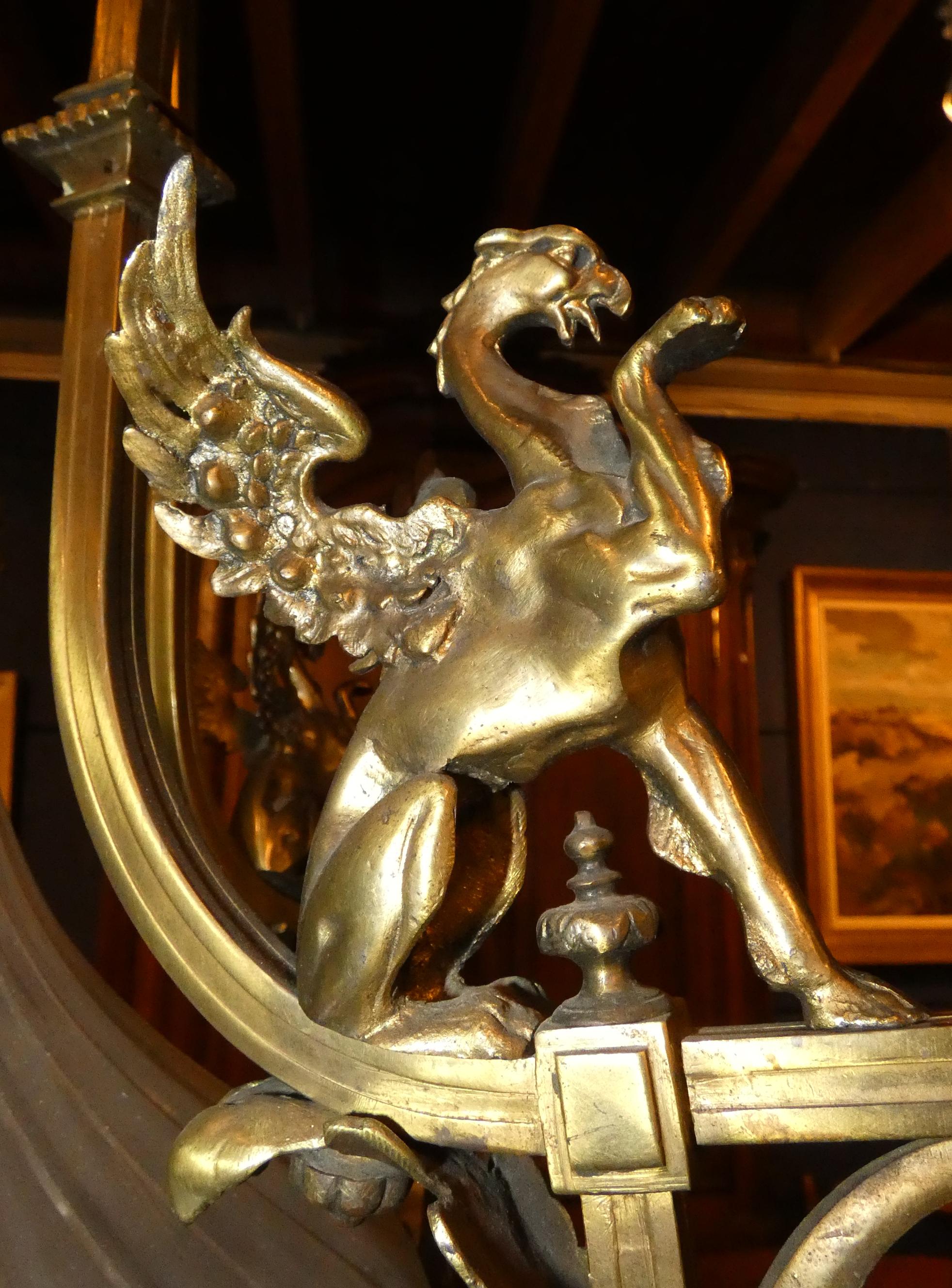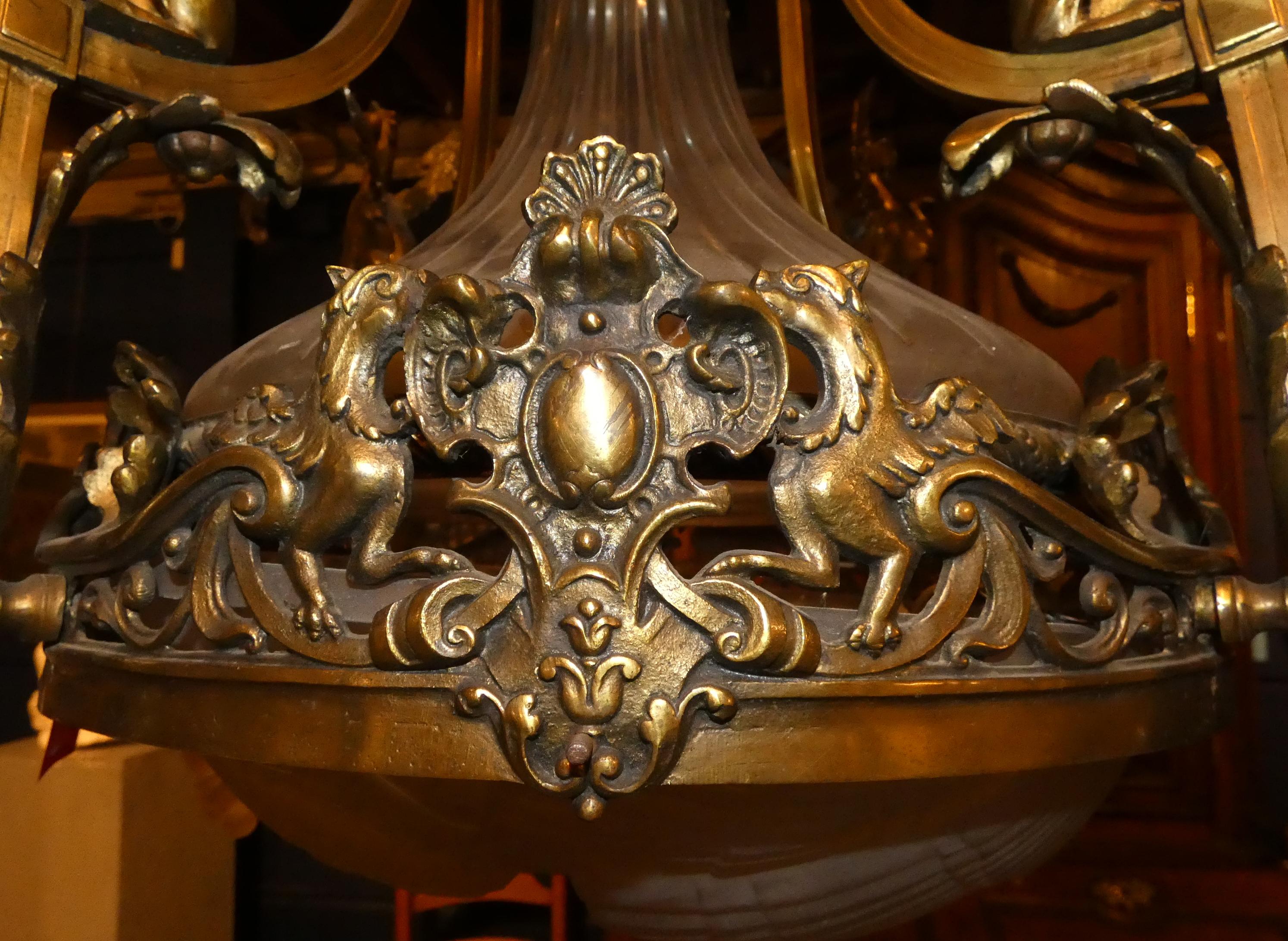 Luminaire: Lustre de style Napoléon III (pt acc fixation) en bronze et verre moulé maté 2e moitié 19eS 4 bobèches flammes décor de griffons et mascarons en verre H:100cm
