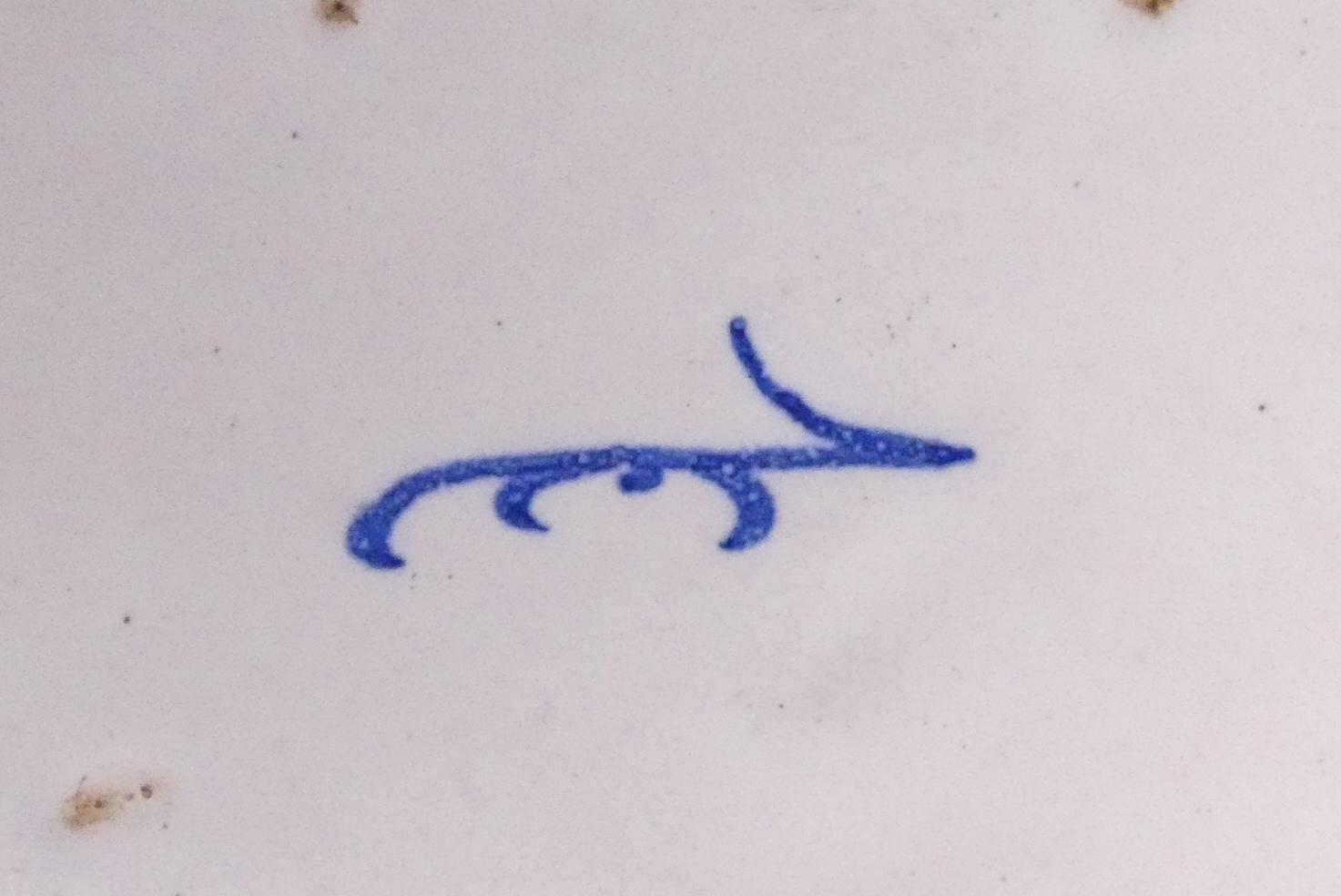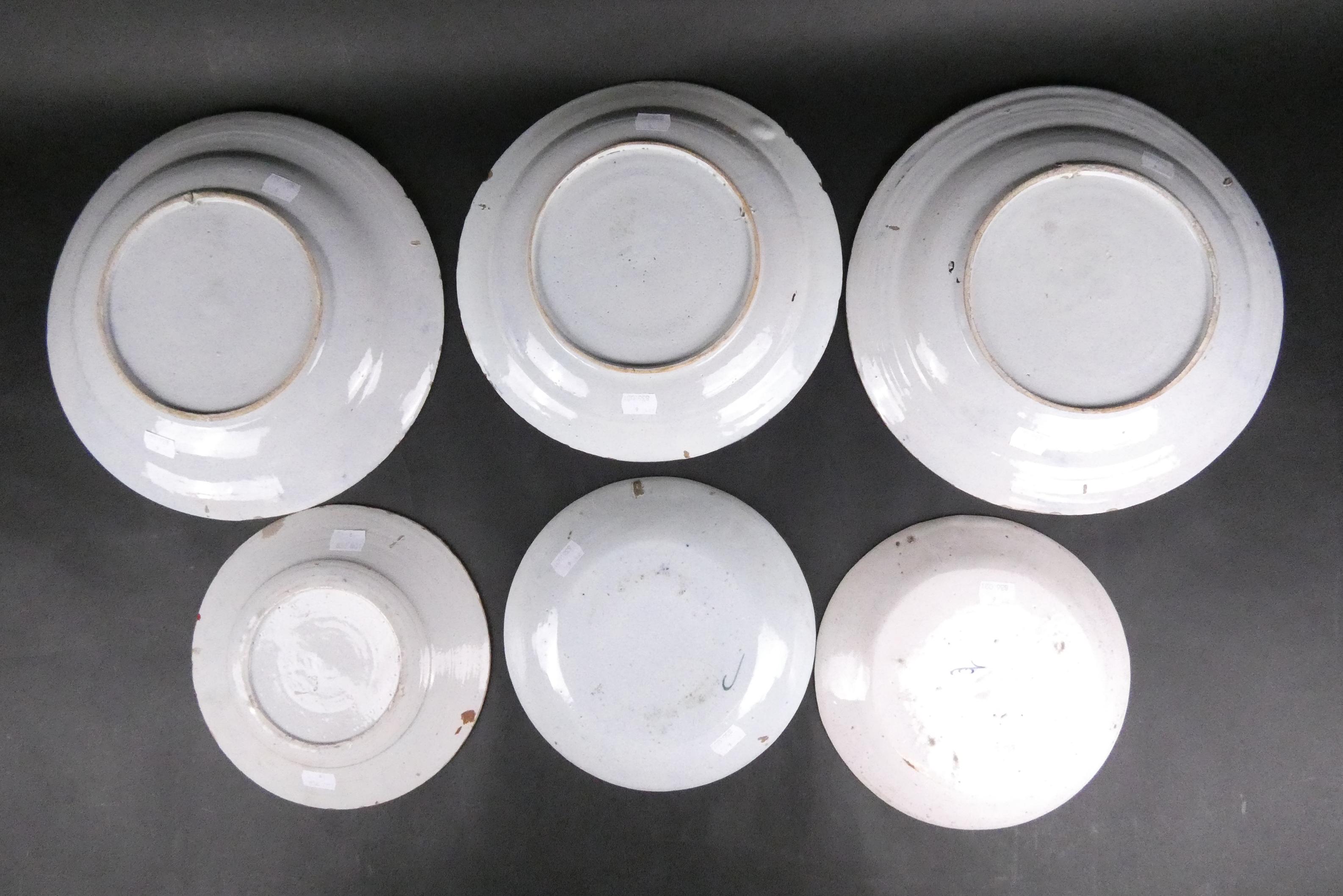 Céramique: Delft ancien probable 17/18eS (6pcs) (egr): paire de plats, plat décor de Chine (1ecl), 3 assiettes pannekoek polychromes 1 avec griffe de porcelaine