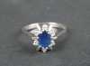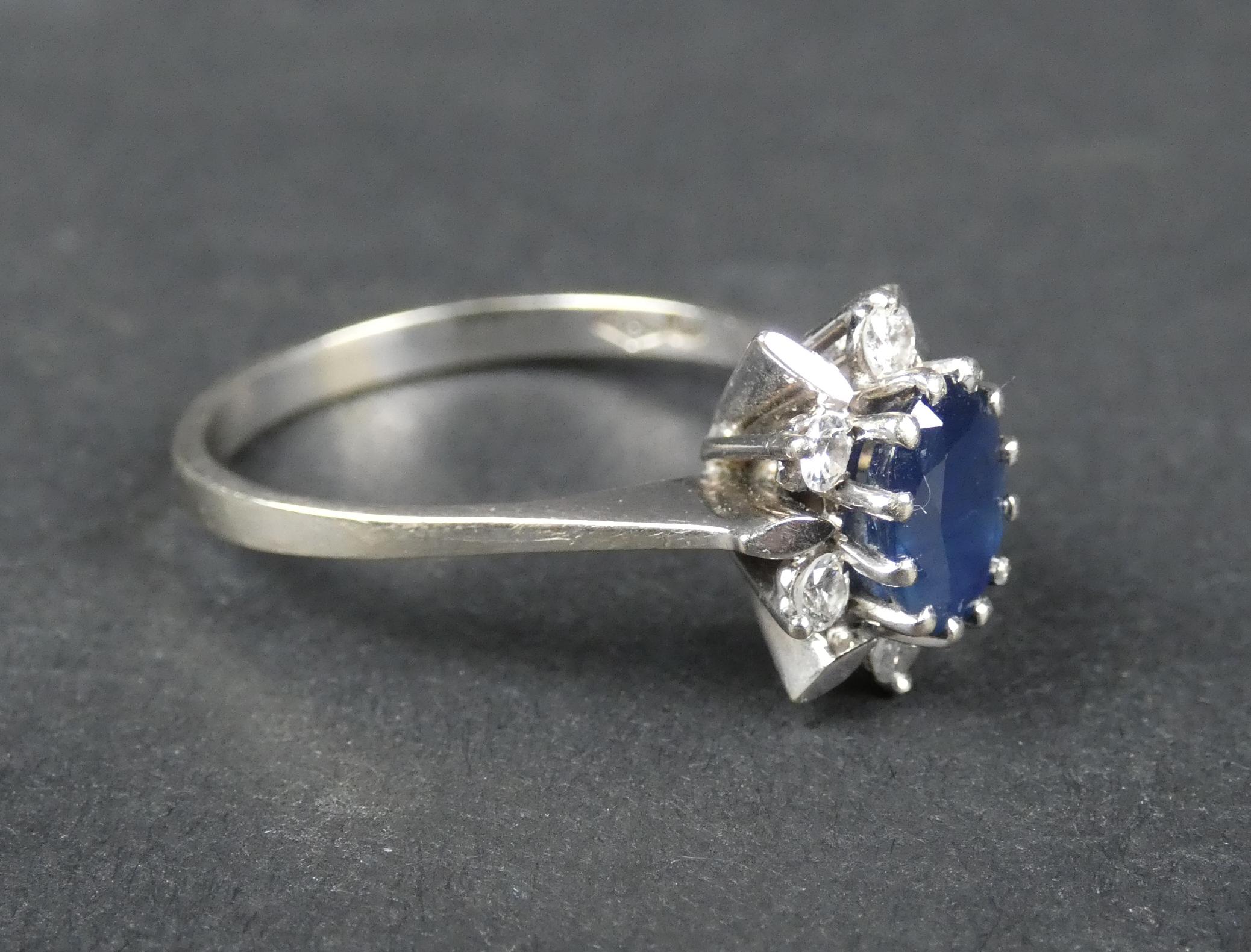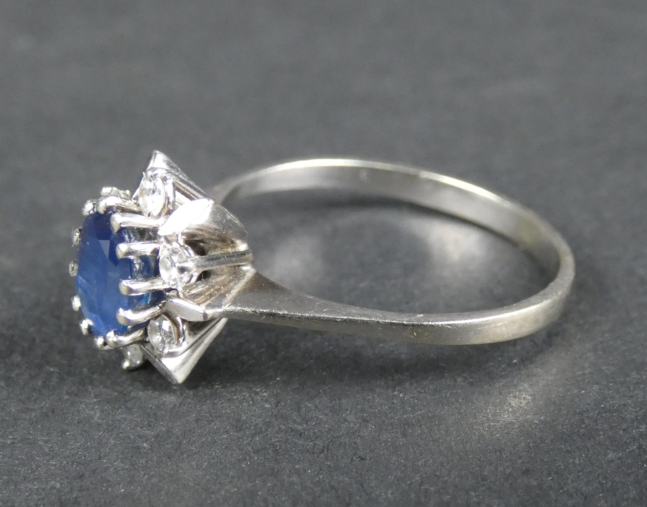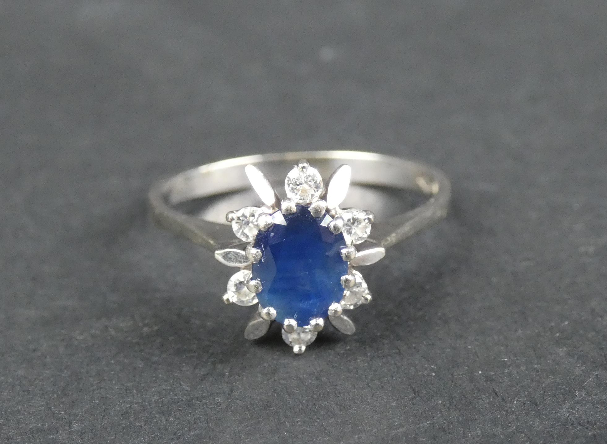 Bijou: Bague en or blanc 18K sertie d'un saphir ovale d'env. 0,75cts entouré de 6 diamants d'env. 0,04cts P: 3,9g TDD: 60
