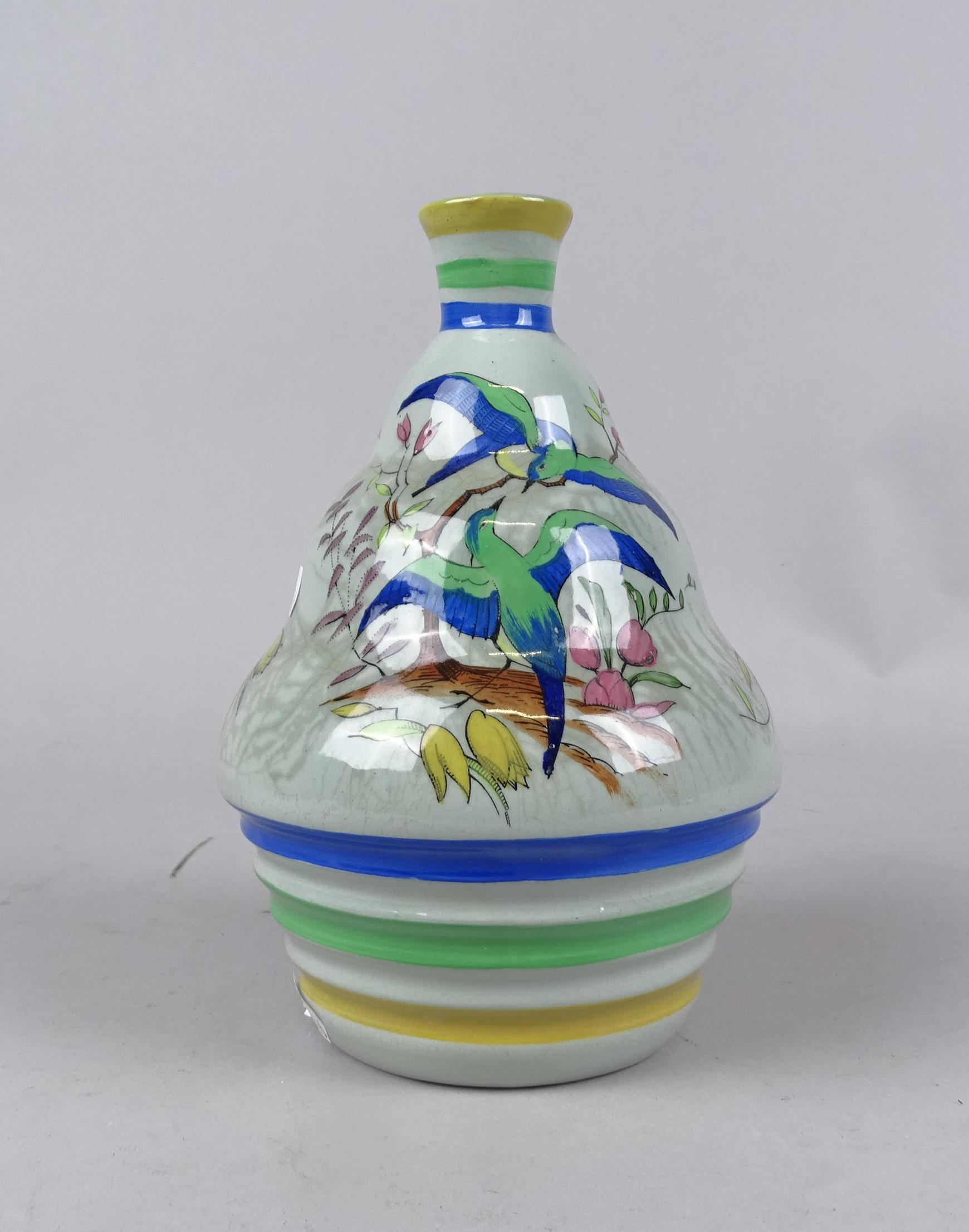 Céramique: Vase en faïence Art Déco émaux peints Keramis D1664 1932 forme 1194 attribué à Georges Tecqmenne rehaussé polychrome d'oiseaux atelier de fantaisie H:19,6cm