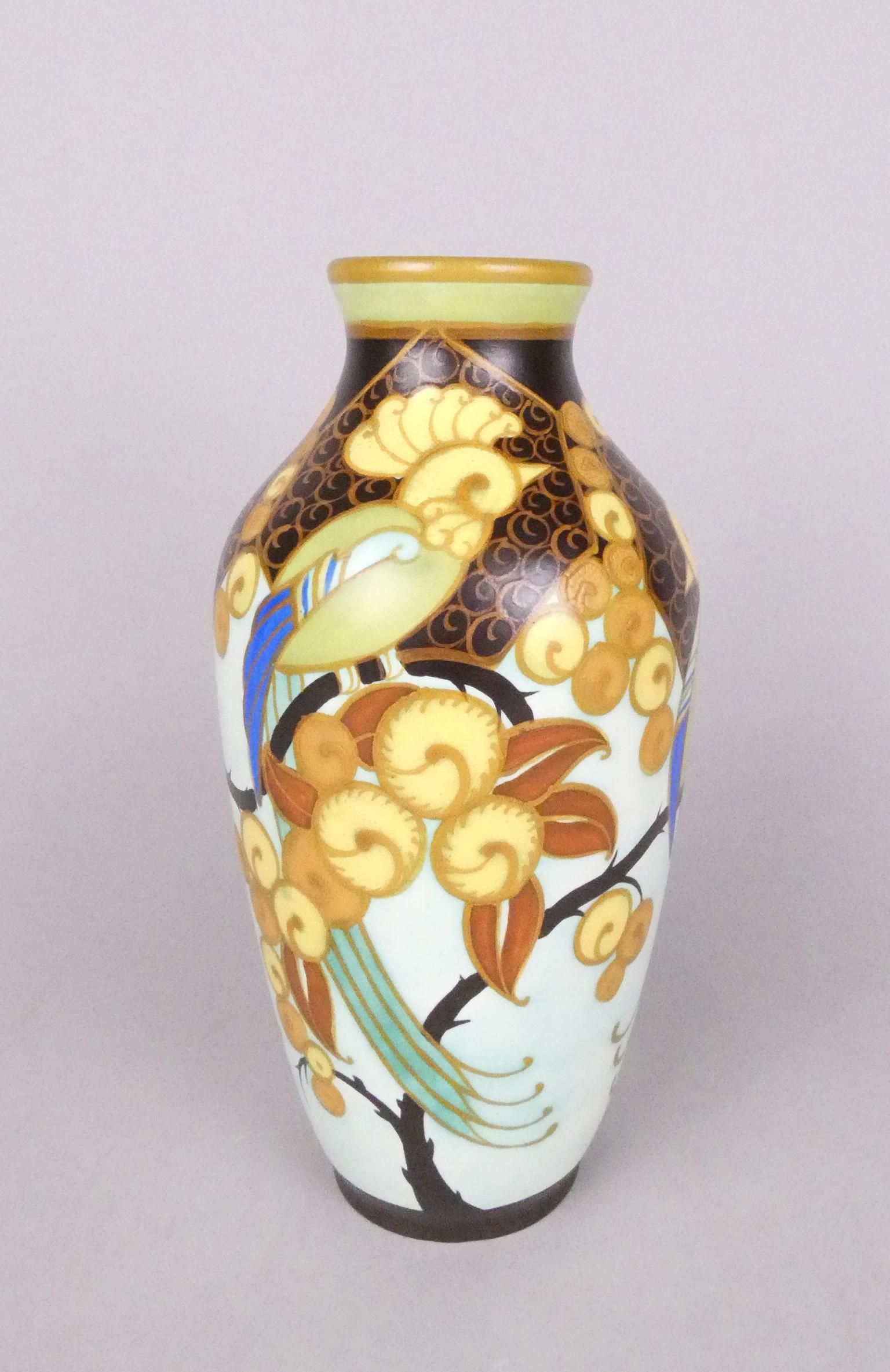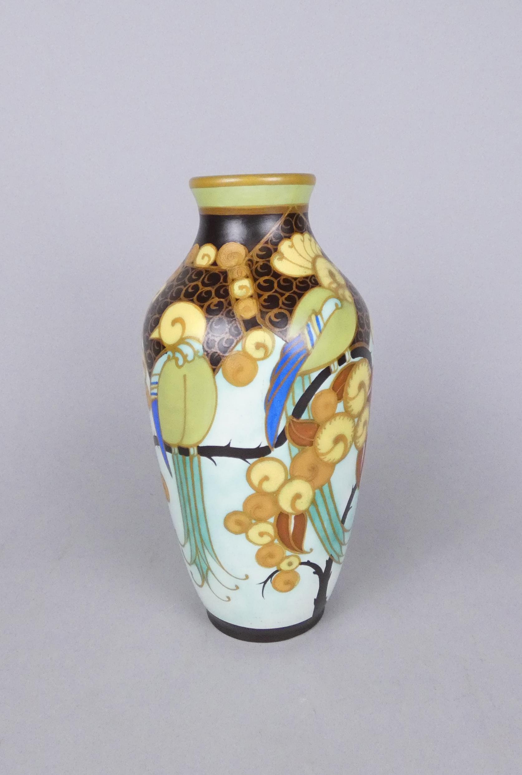 Céramique: Vase en faïence Keramis (chv) D1130 F806 monogrammé LD *DELFANT L.* (Léon) (1906, 1966) décor d'oiseaux exotiques et motifs floraux H:27,4cm