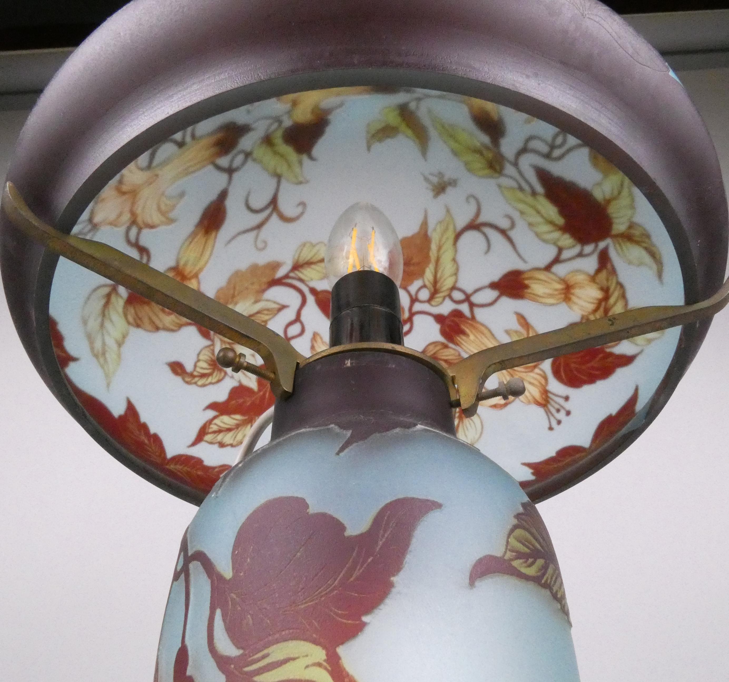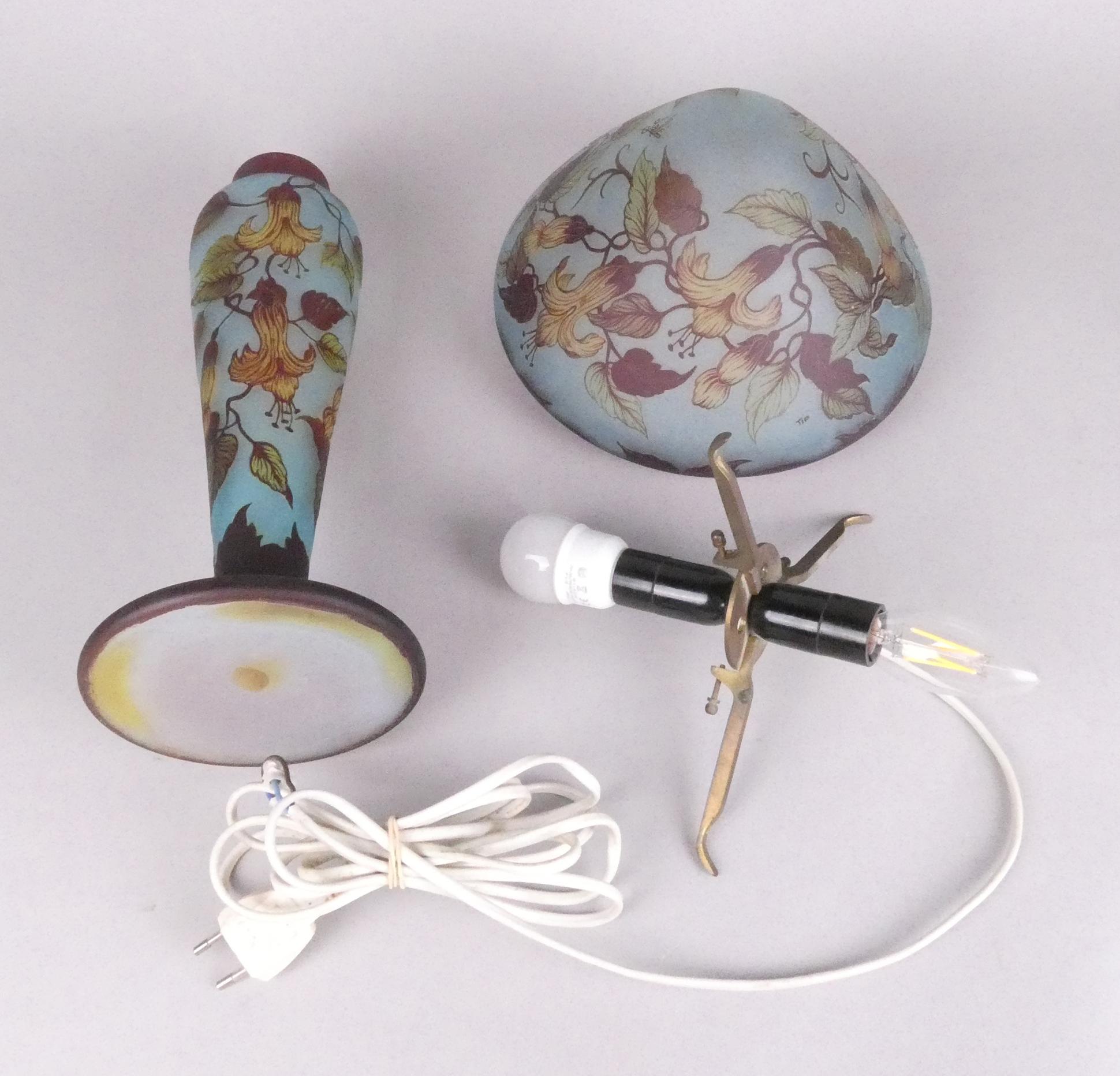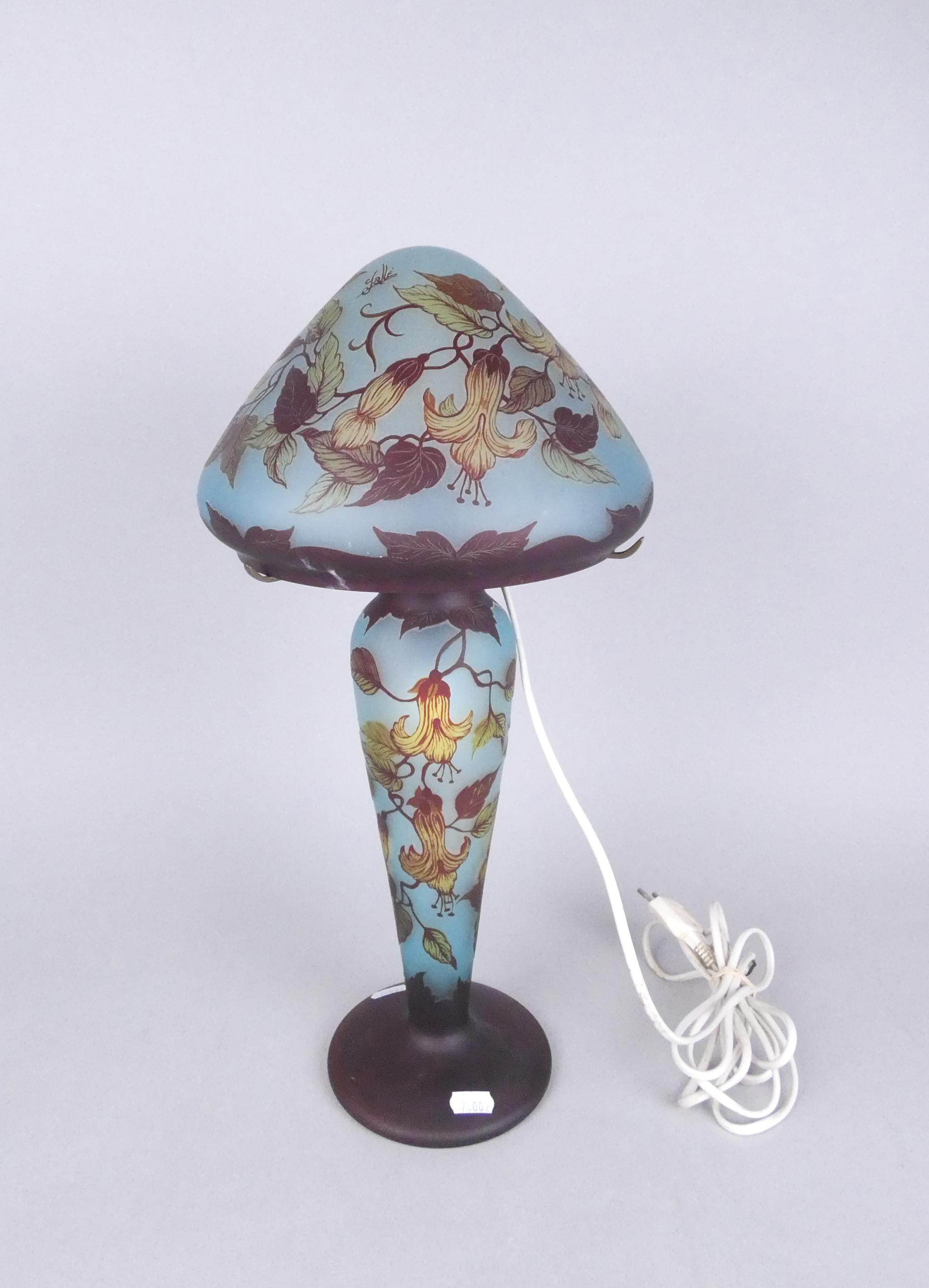 Luminaire: Lampe Champignon en verre (Bel état gen. Pt ecl int) signé TIP GALLE production moderne sur le pied et le chapeau 2 lumières H:51cm