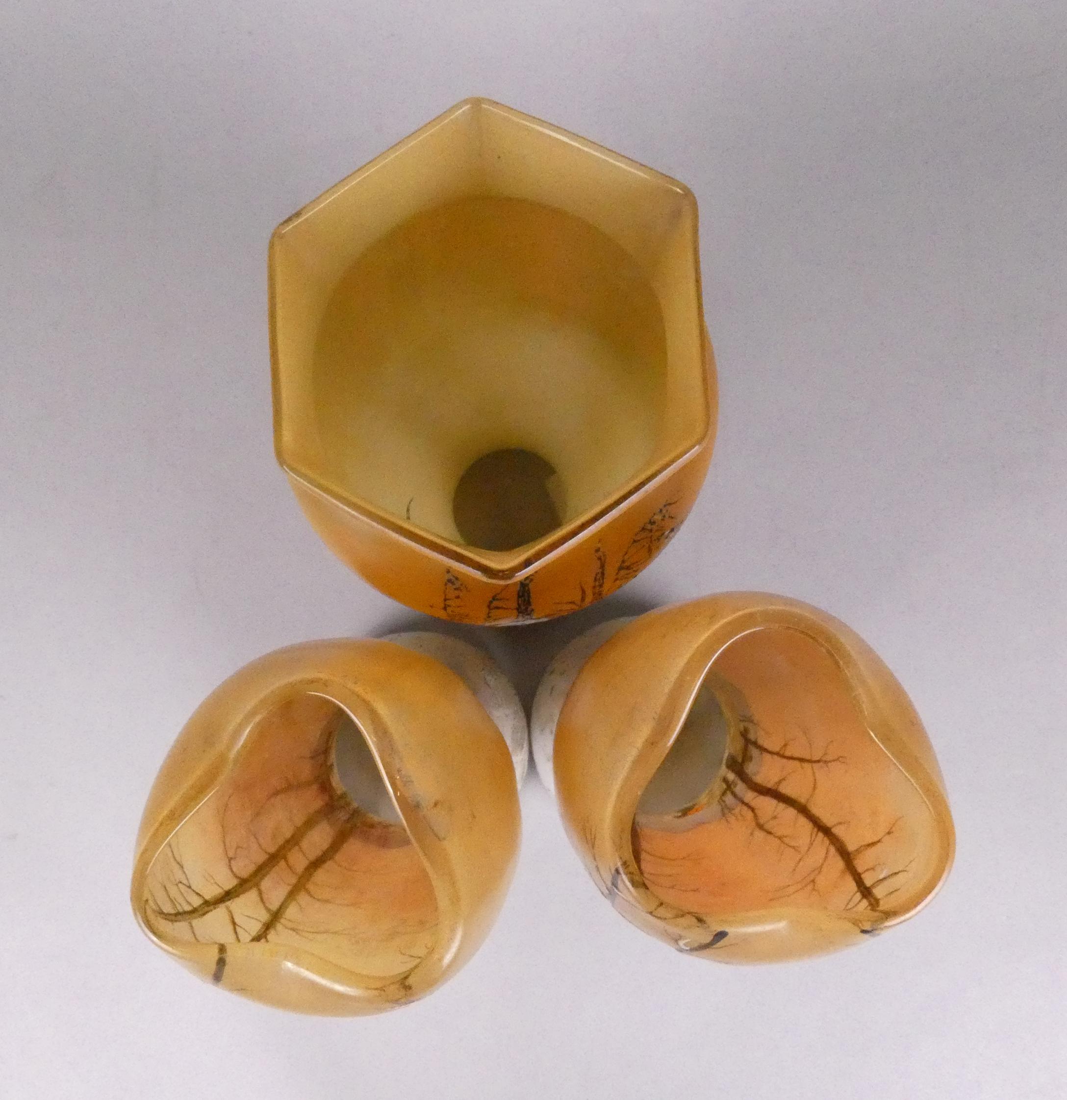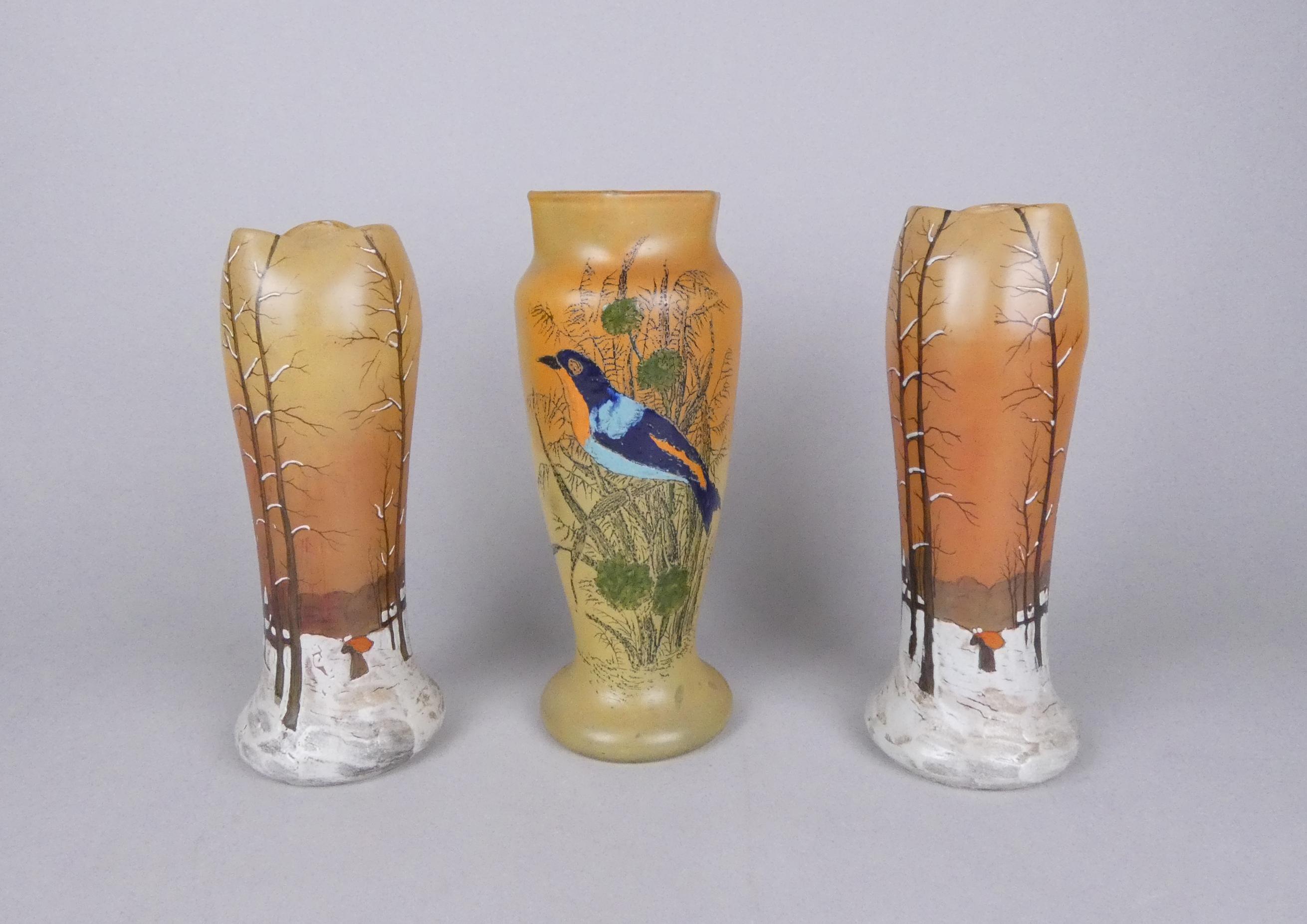 Verrerie : attribué à LEGRAS (3pcs) : paire de vases à décor hivernal animé + 1 vase à décor d'un oiseau