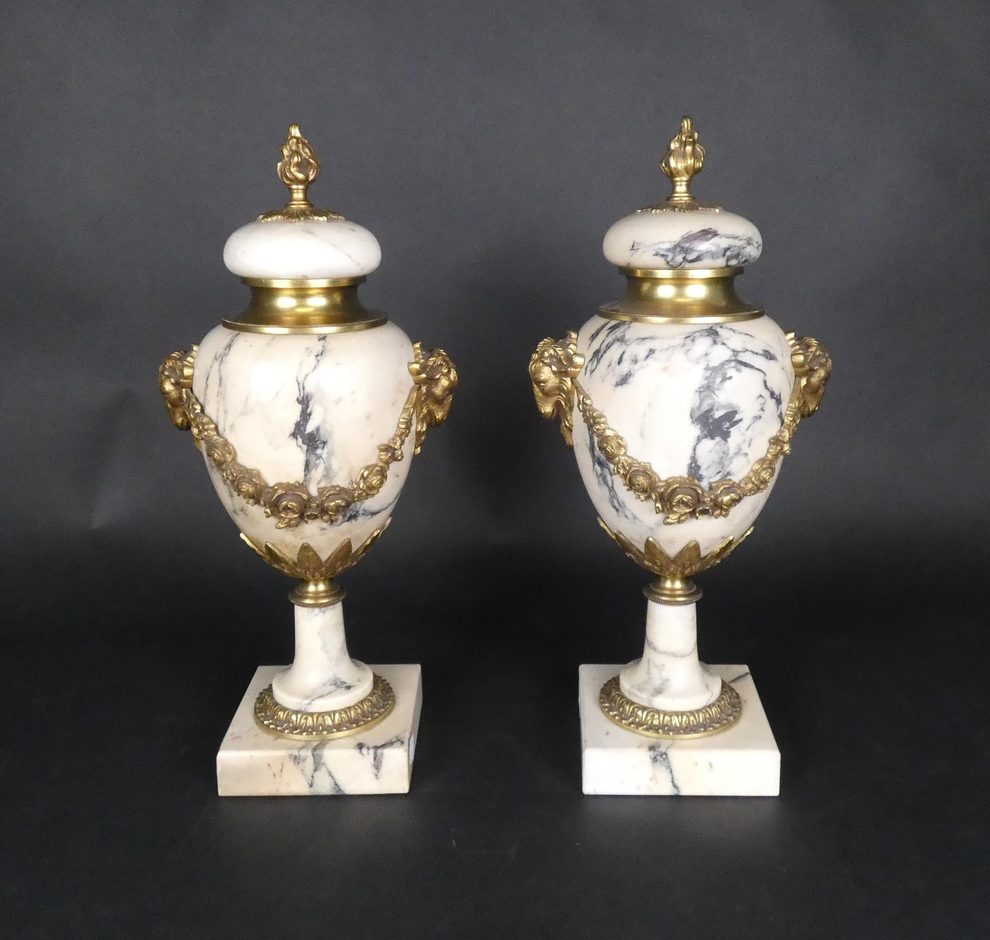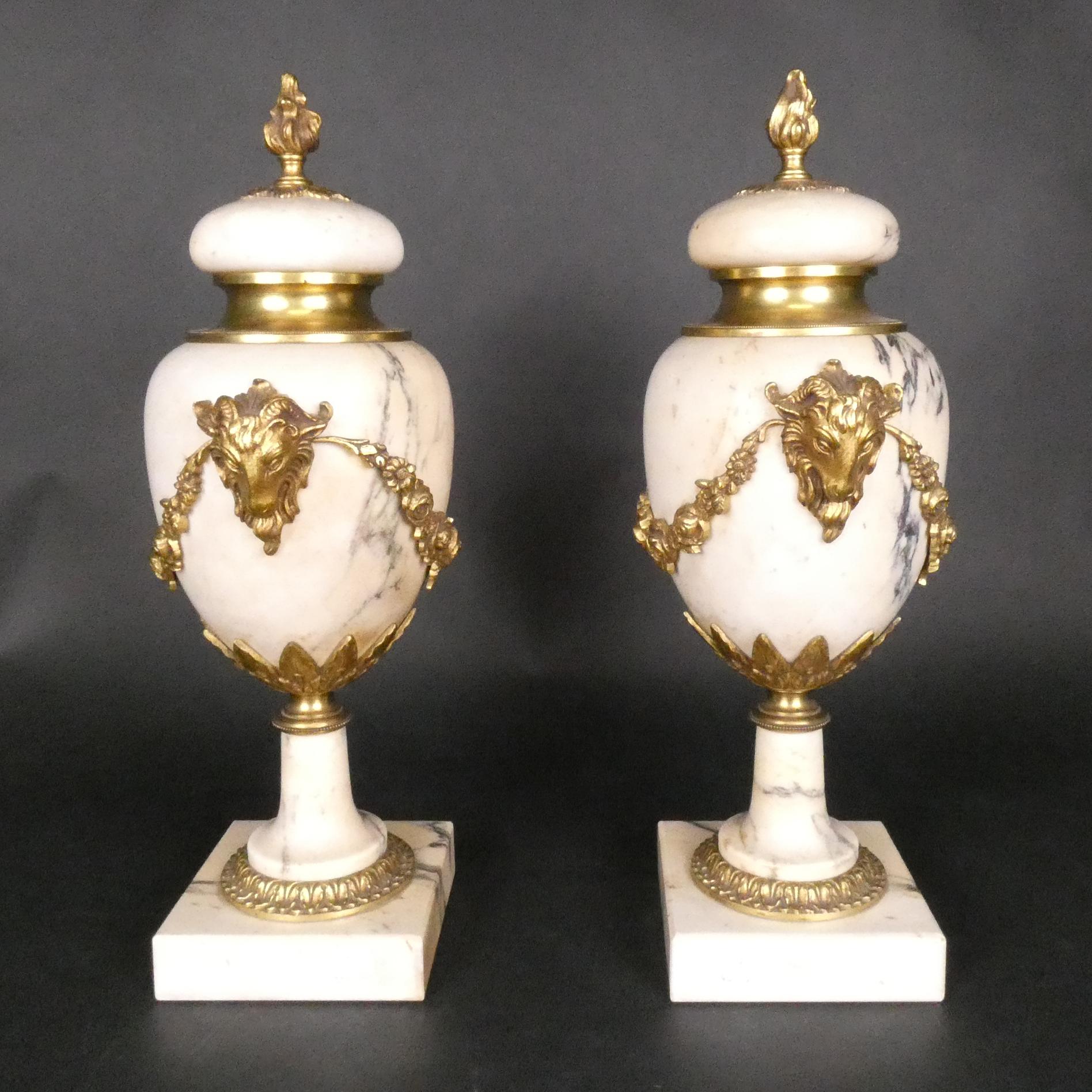 Objet: Paire de cassolettes en marbre et bronze doré ciselé à décor de béliers et de guirlandes de fleurs H:44cm