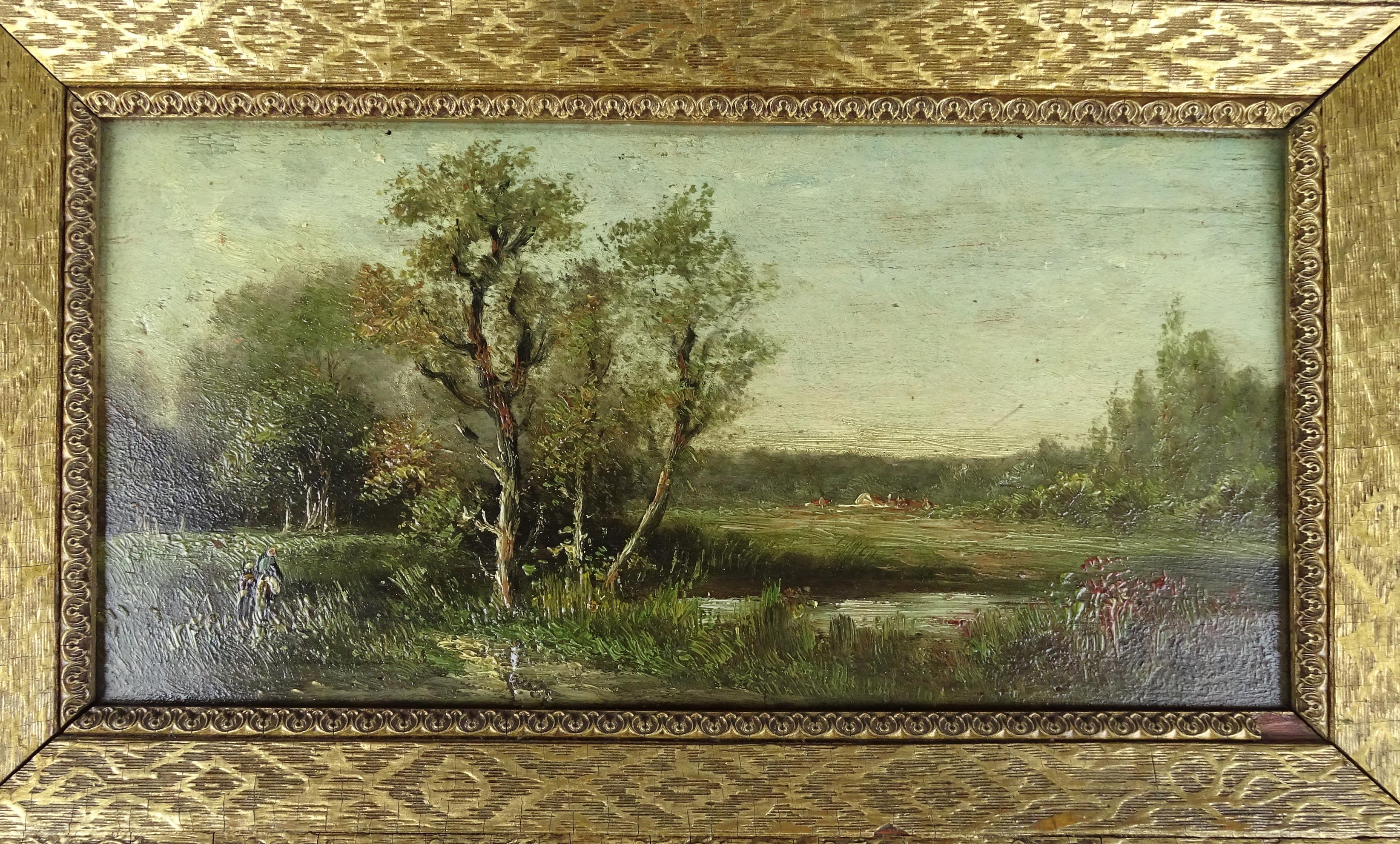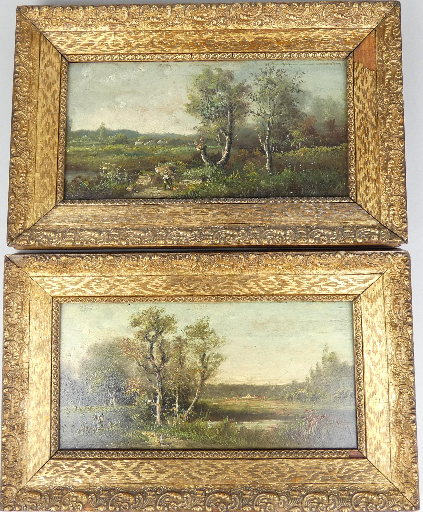 Tableau HSB d'acajou (2pcs) -Paysage animé- anonyme fin 19eS 18x36cm cadre de style doré (lacunes)