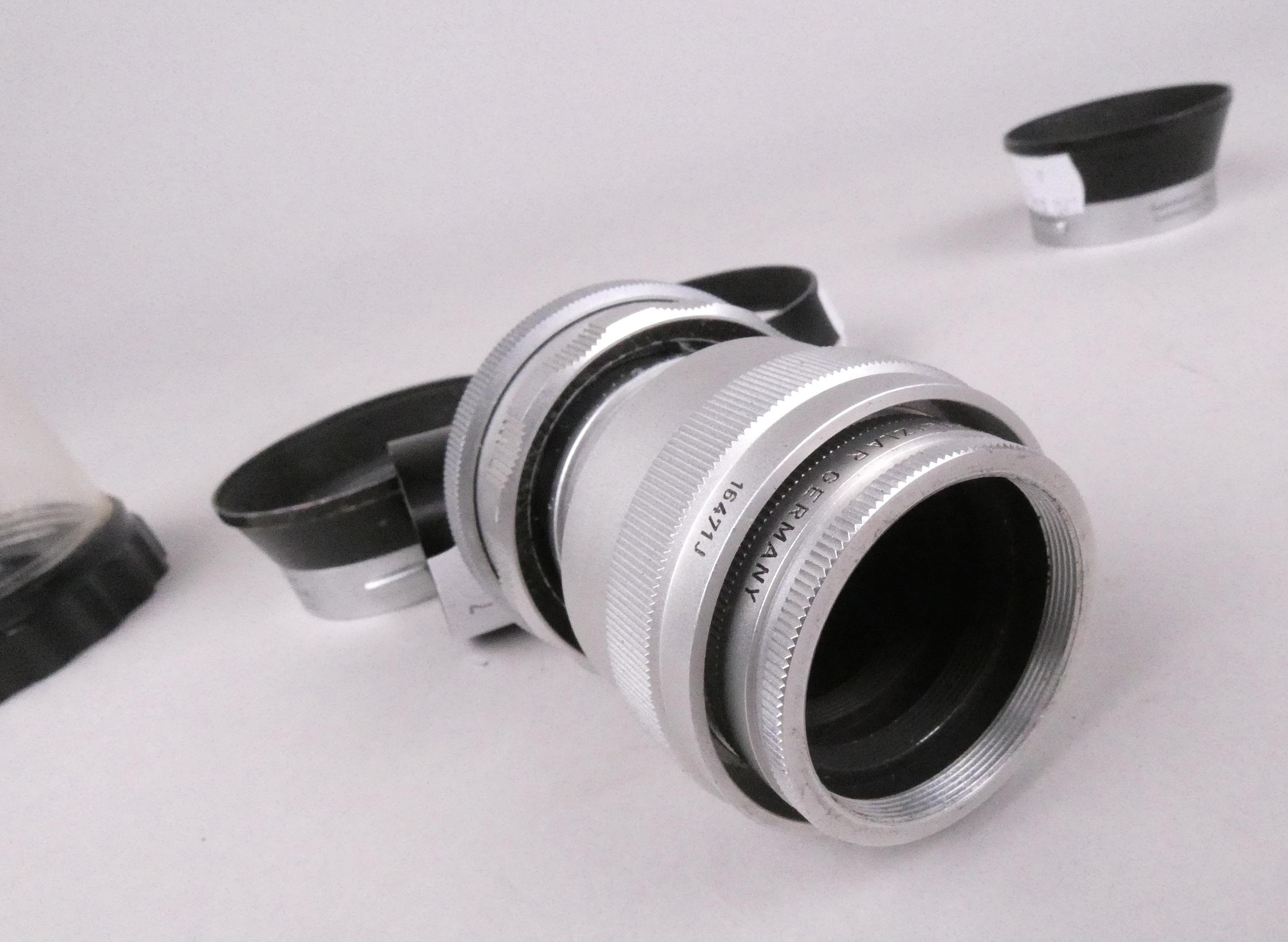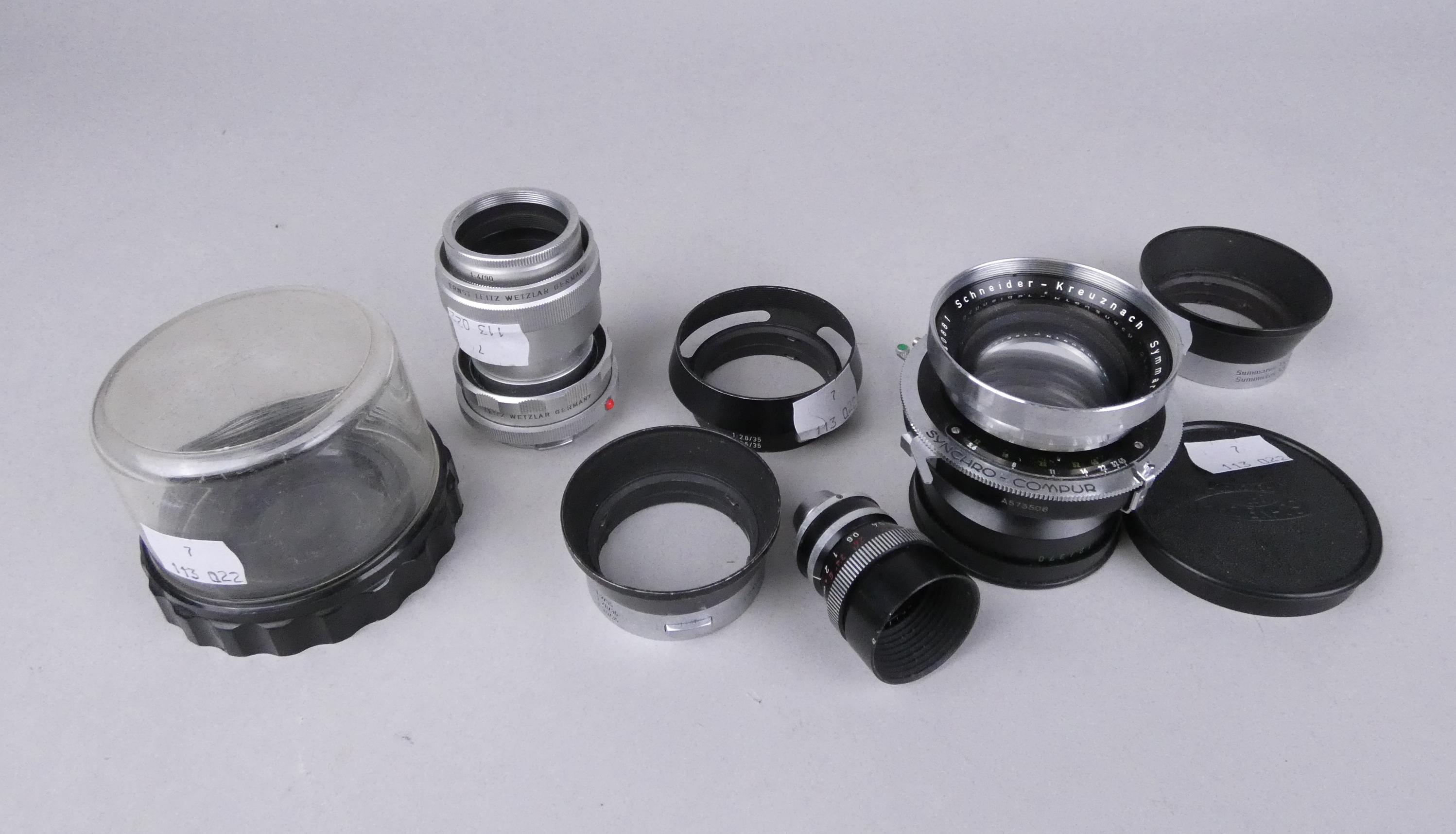 Objet: accessoires pour appareil photographique (7pcs) dont: Objectif Schneider Kreuznach Symmar 1:5.6/210 + objectif Leitz (ds l'état).