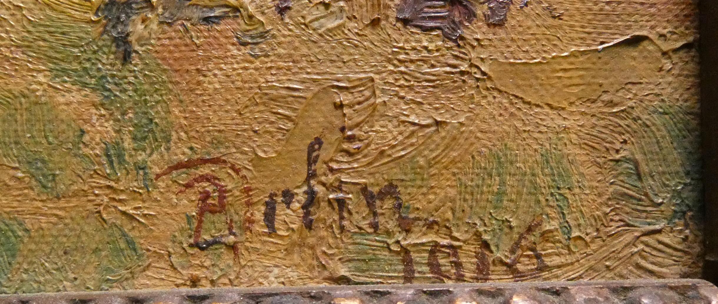 Tableau HST -Prairie animée- daté 1916 signé *DELIN R.* (René) (1877, 1961) 27x16cm cadre de style patiné