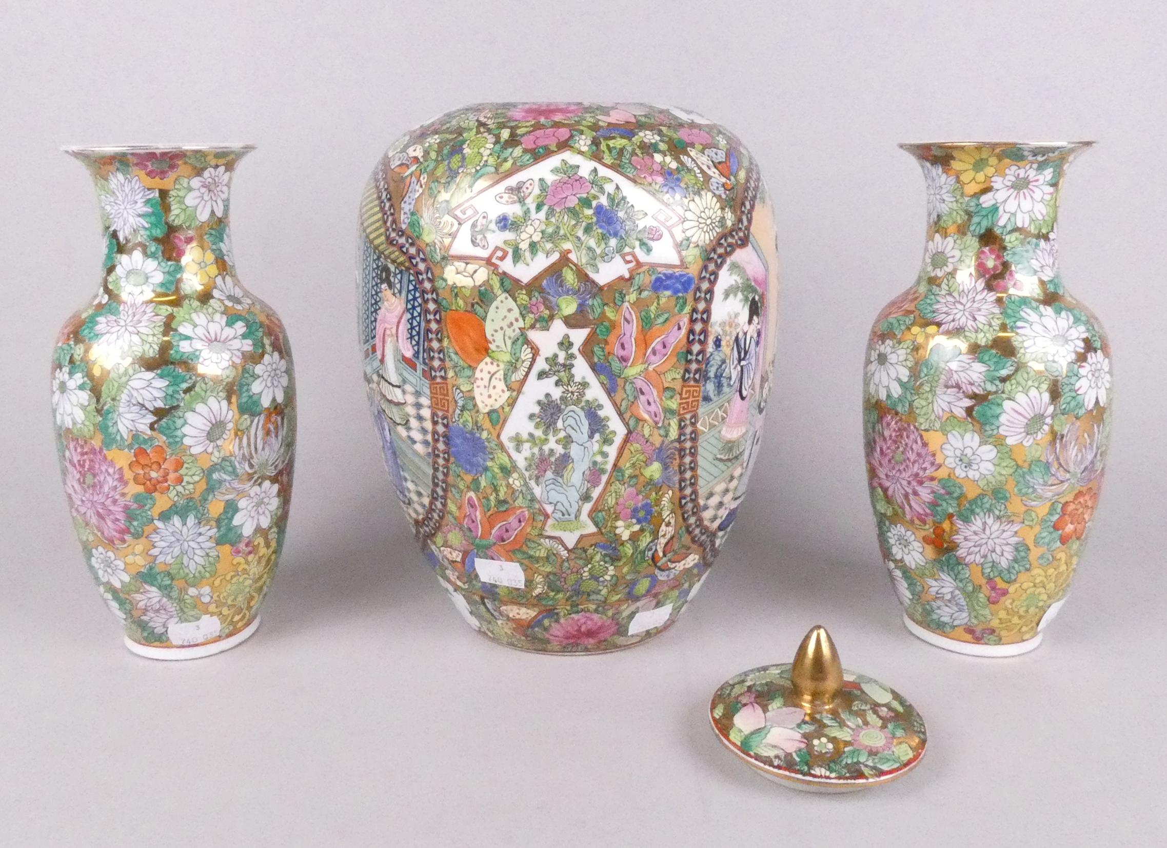 Asiatique : Porcelaine de Chine (3pcs) : paire de vases + pot couvert