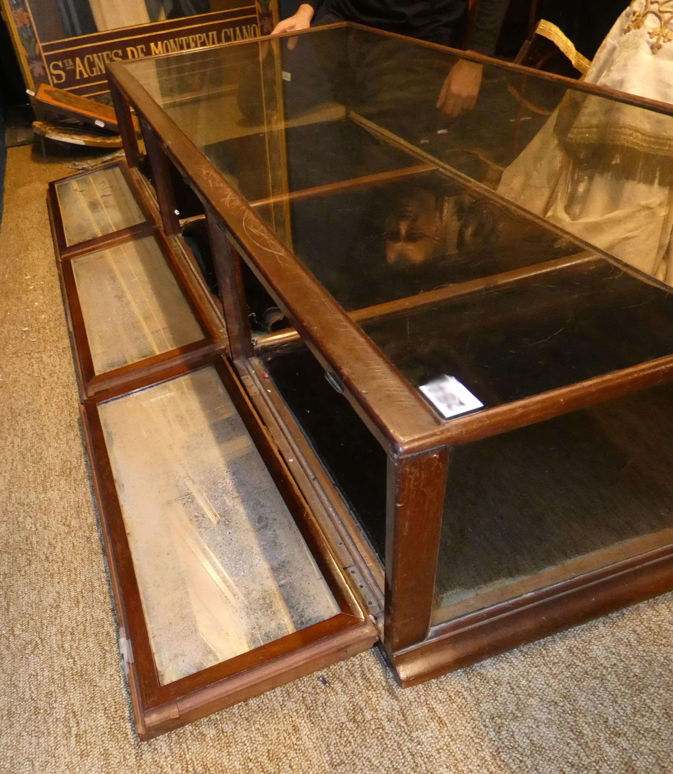 Meuble: Vitrine de magasin en bois et en verre fin 19eS fond à 3 miroirs formant portes s'ouvrant sur l'arrière 25x152x61cm