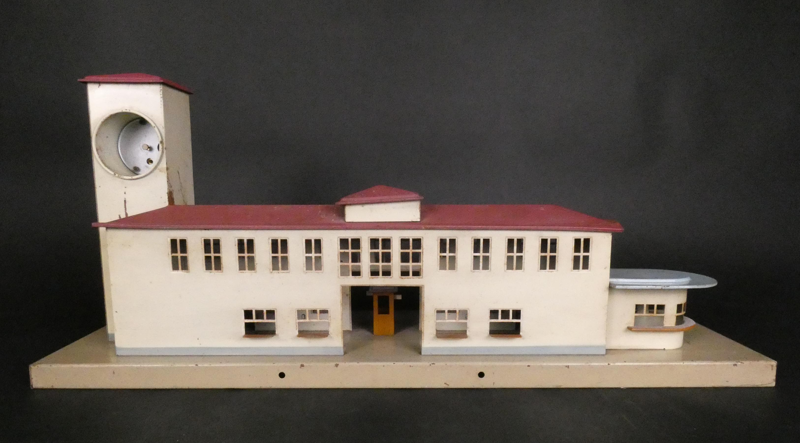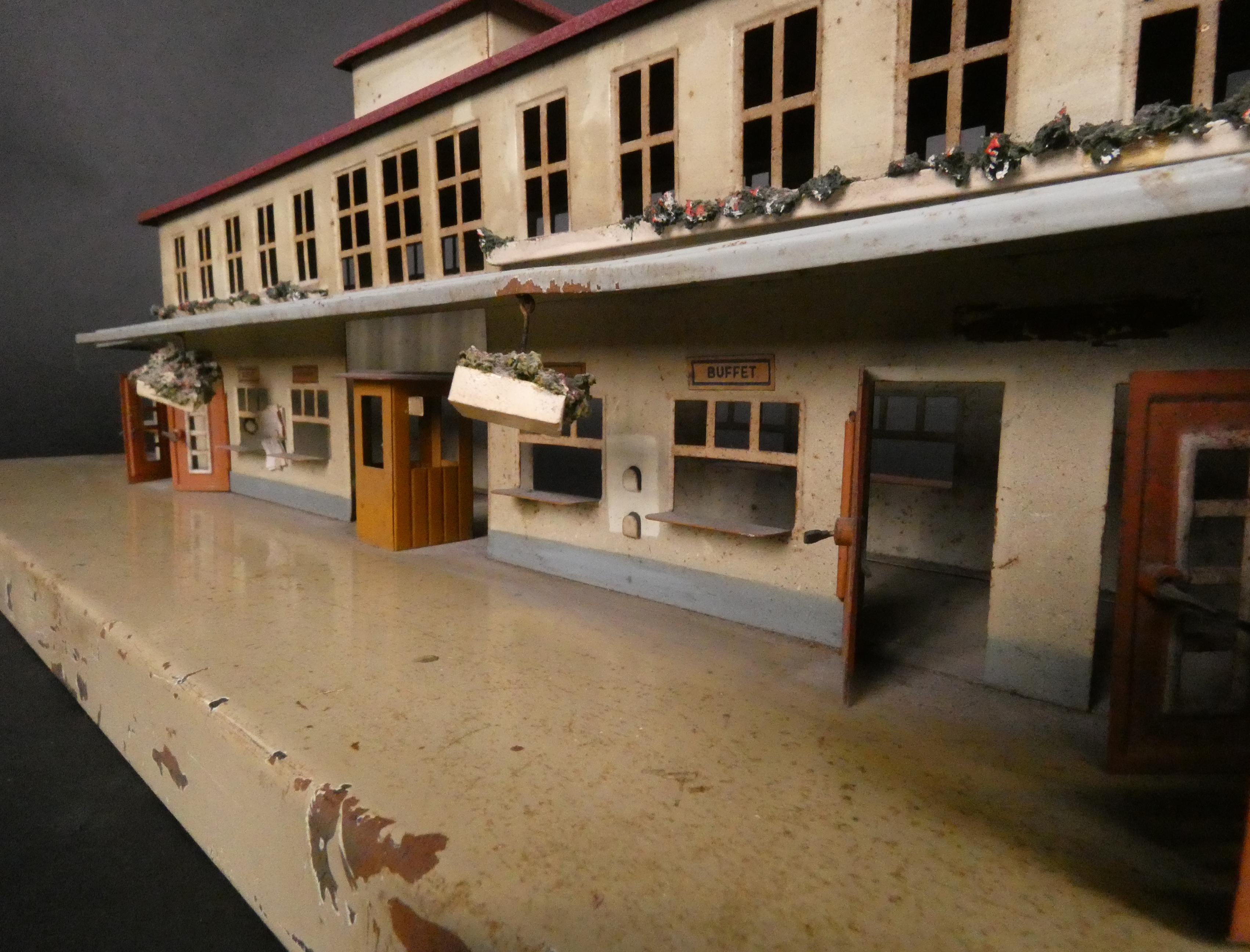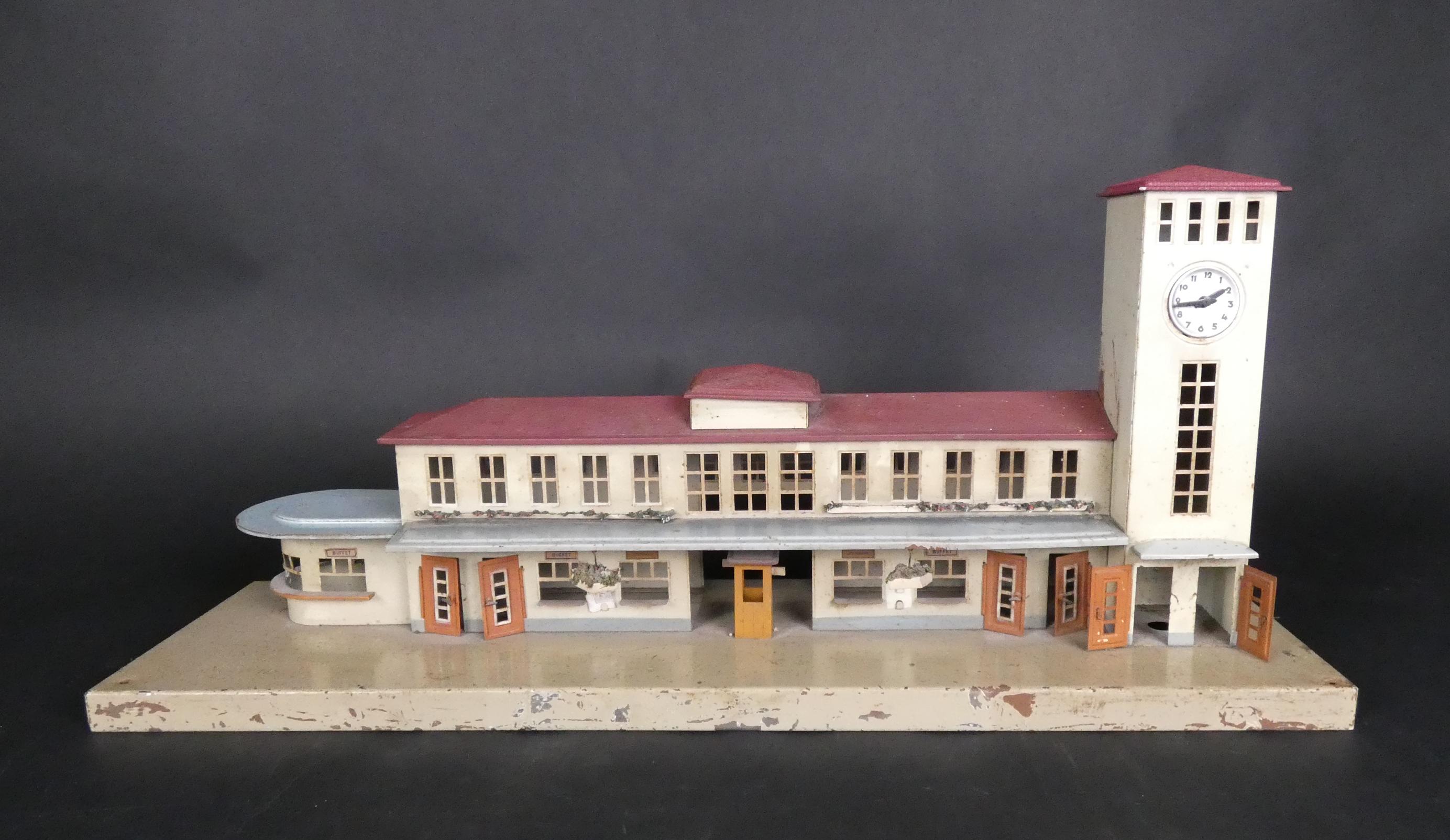 Jouet: Train: gare en tôle lithographiée KIBRI avec horloge (Usures, acc) L: 66cm