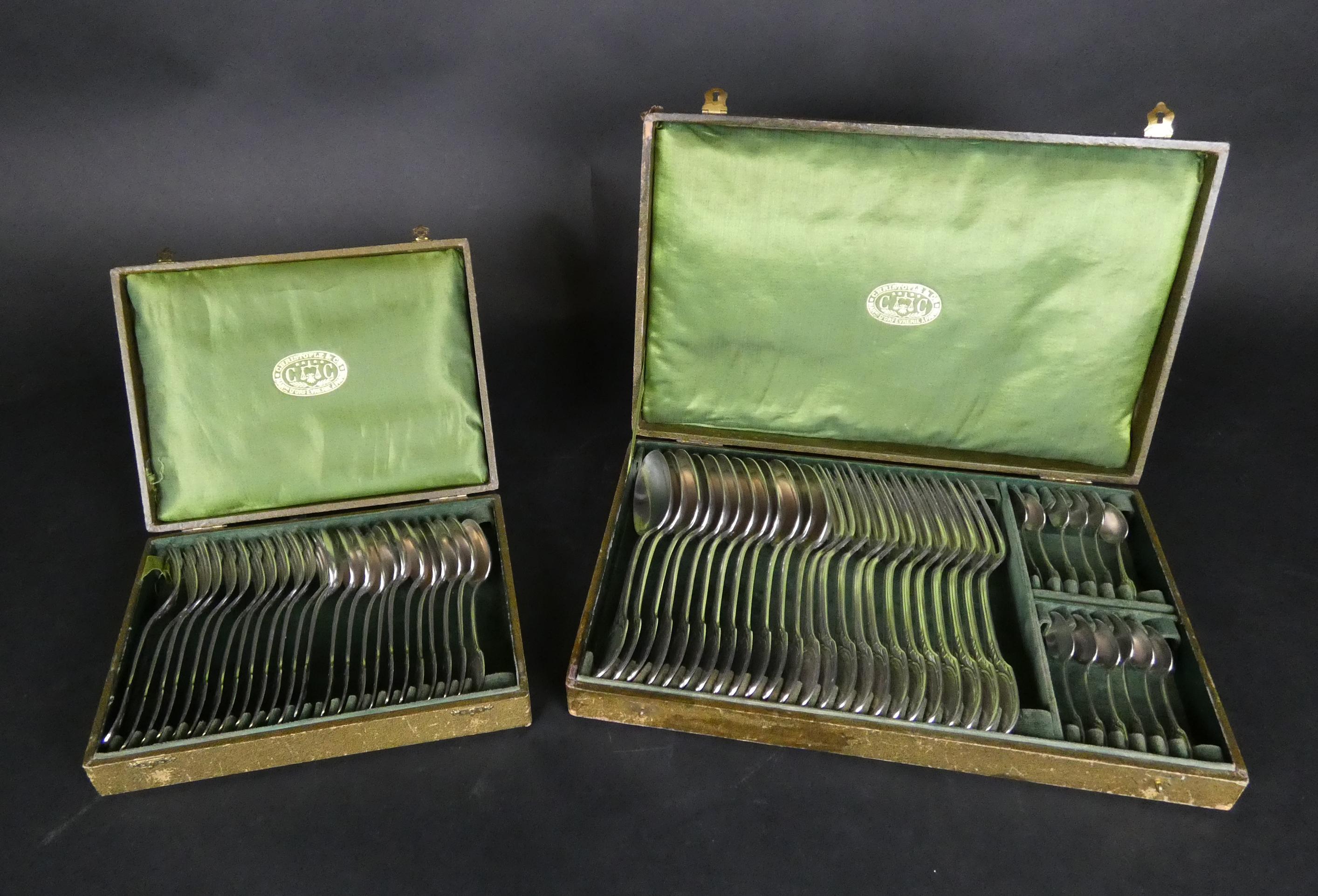 Argenterie: CHRISTOFLE couverts modèle Marie-Antoinette en métal argenté (60pcs): Fourchettes et cuillères de table, fourch et cuill à HO et cuillères à café (En coffret)