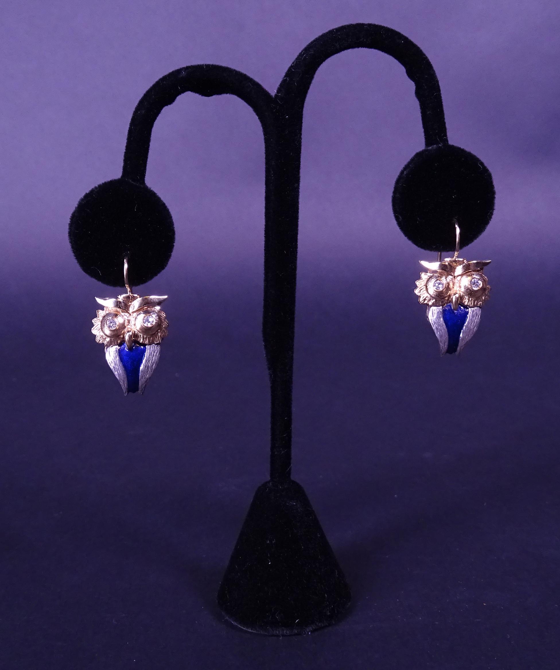 Bijou: Paire de boucles d'oreilles -Hiboux- or 9K et argent emaux bleu sertis de diamants pour 0,18cts P:6,7gr