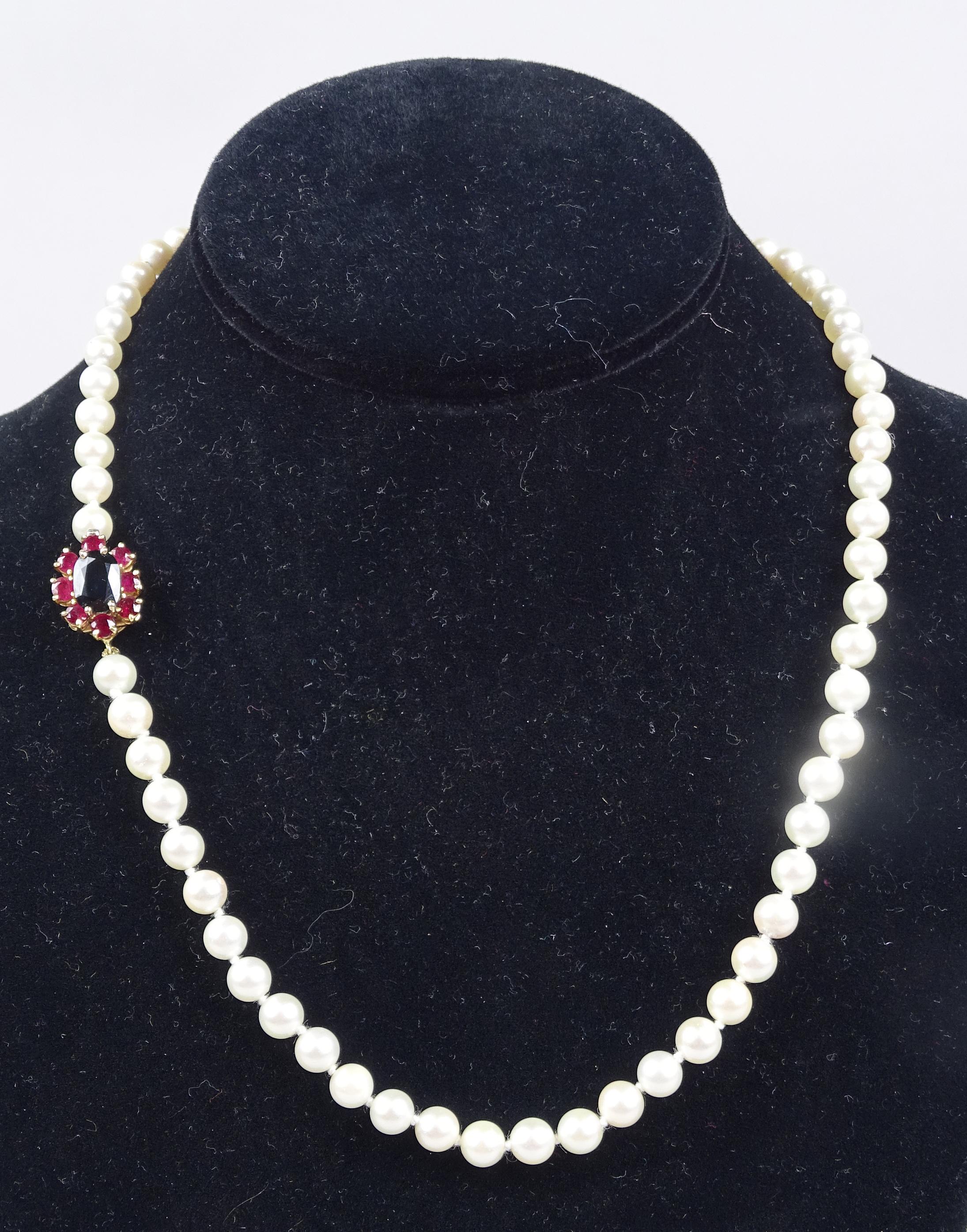 Bijou: Collier de perles de culture avec fermoir en or jaune 18K serti de rubis pour env. 0,90cts et d'un saphir d'env. 2,5cts L: 48cm