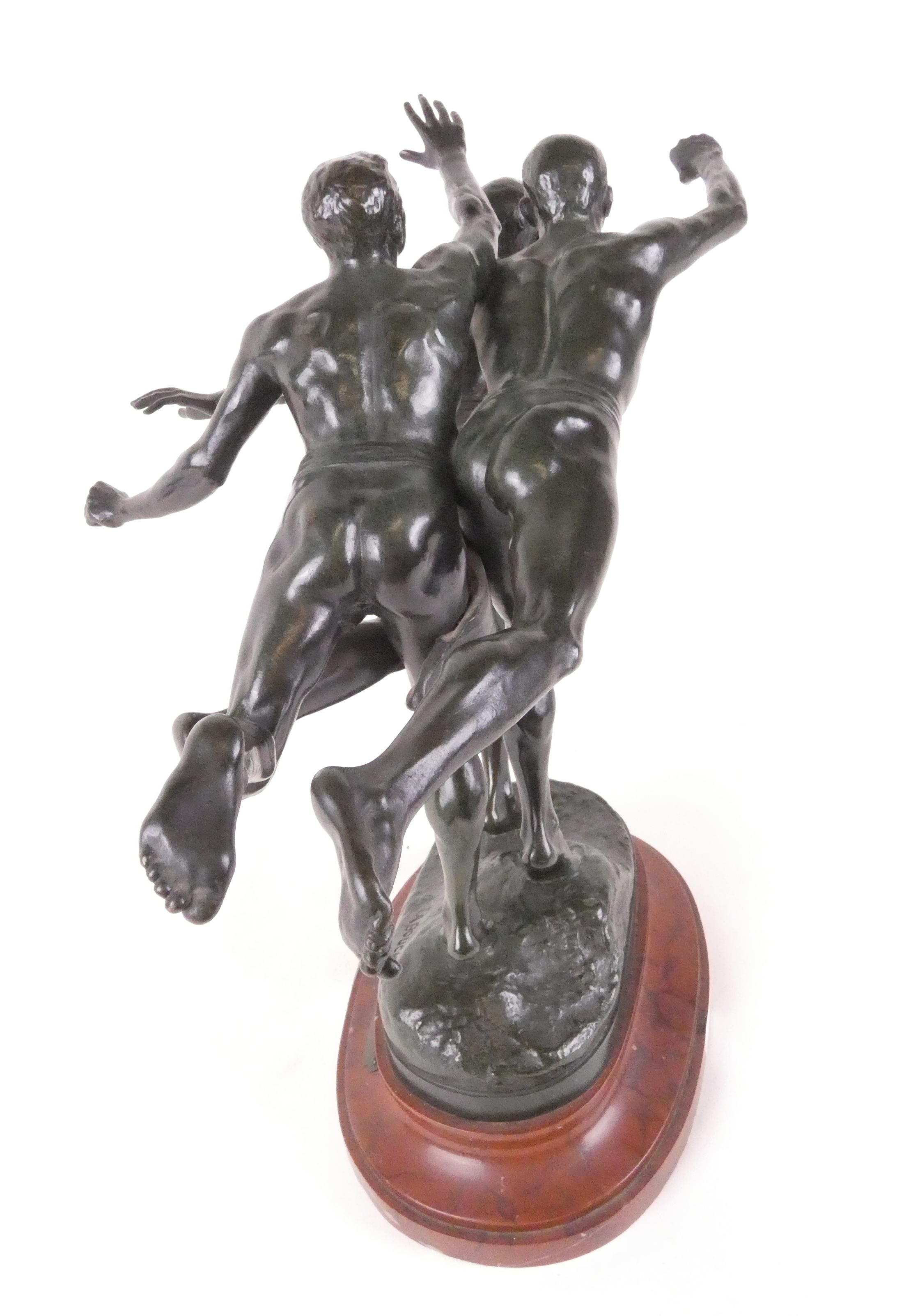 Sculpture: Bronze à patine verte -au But les Trois Coureurs- signé *BOUCHER A.* (Alfred) (1850, 1934) cachet du fondeur Siot Paris 28x42x21cm socle de marbre griotte