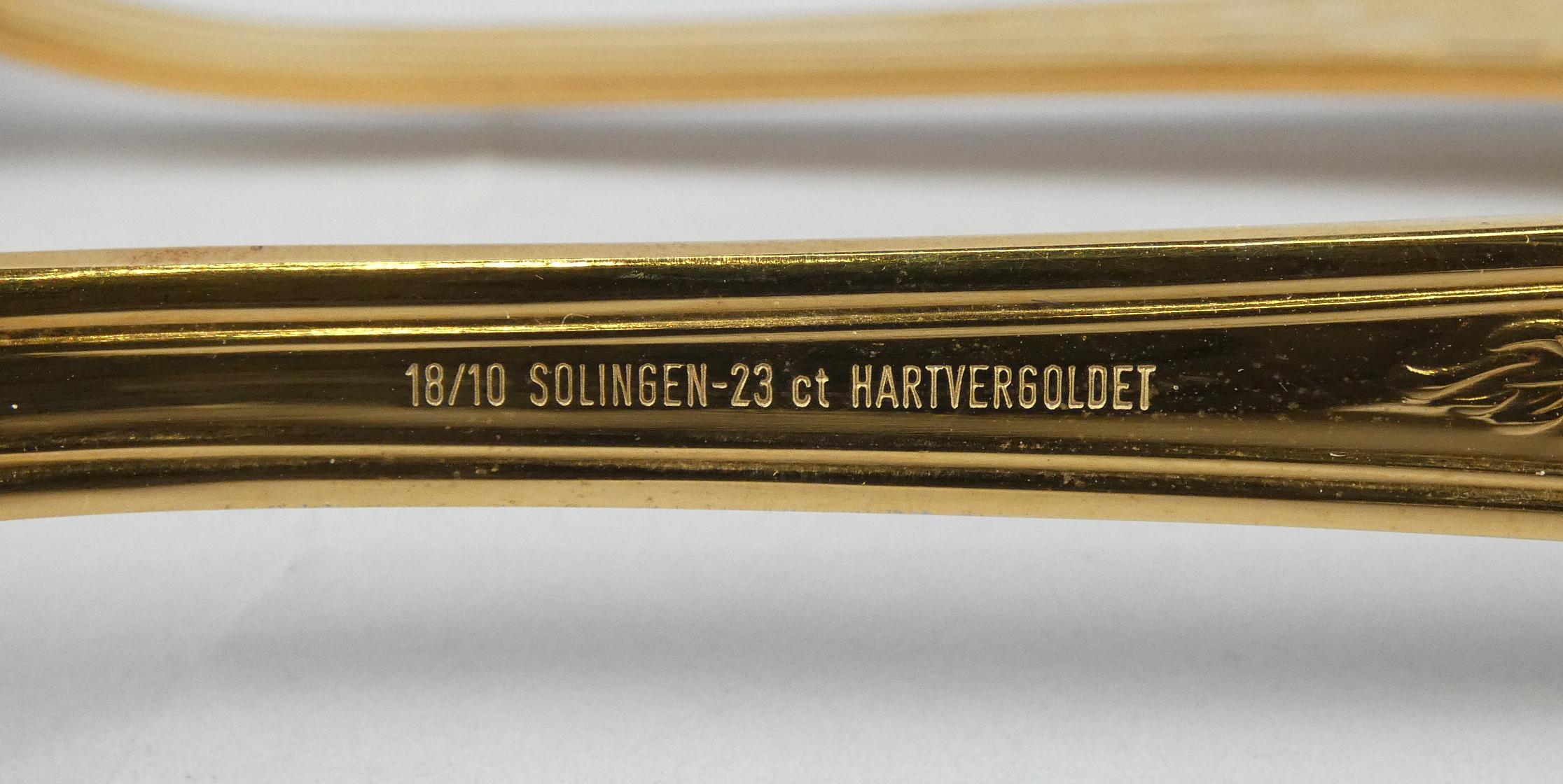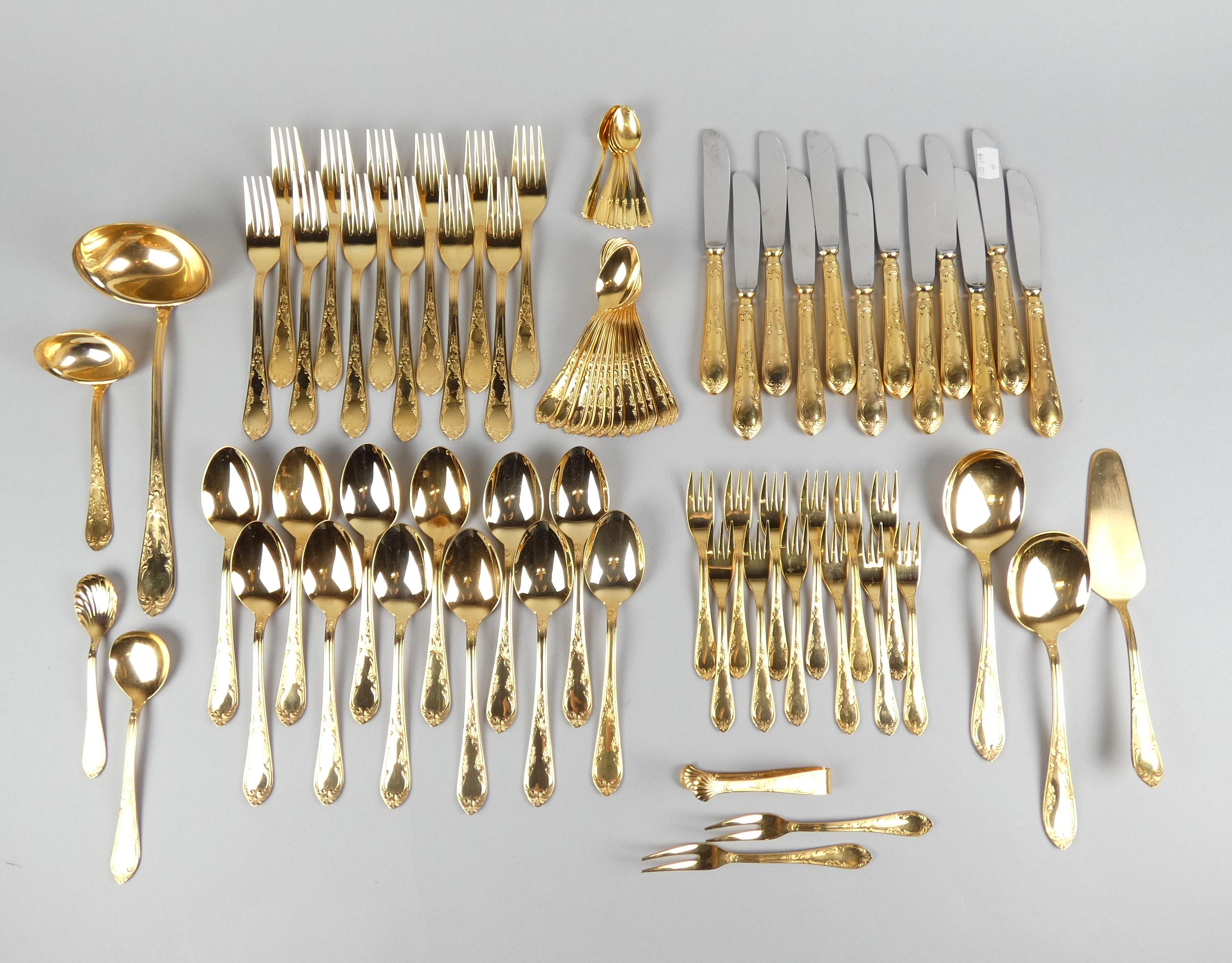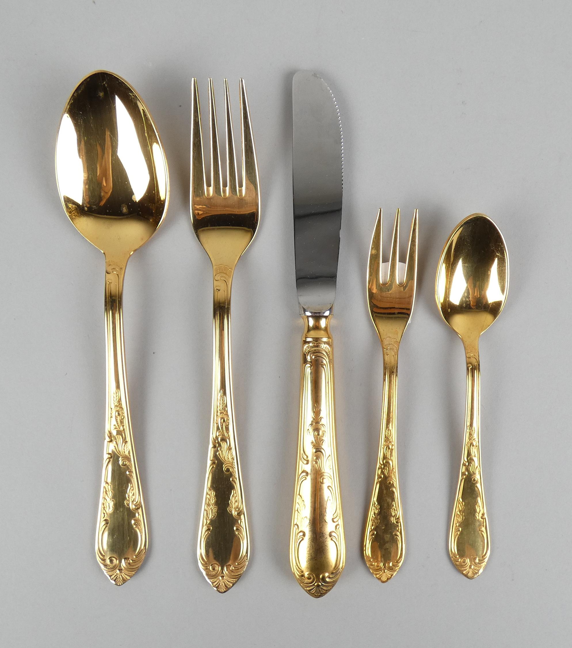 Argenterie: Ménagère en métal doré marqué SBS Solingen 12 couverts (60pcs) + 6 cuillères à moka + 10 couverts à servir (76pcs)