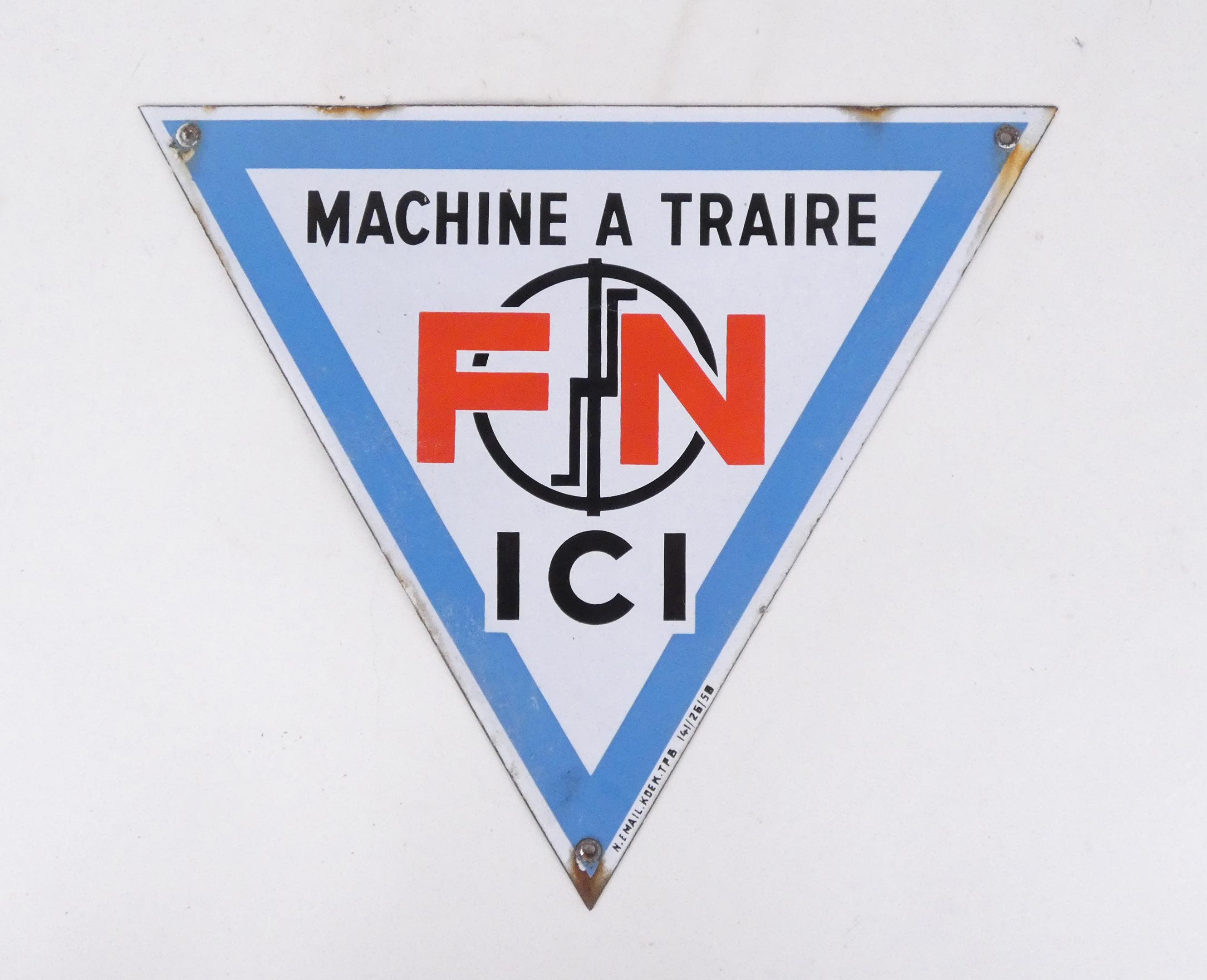 Objet : Plaque publicitaire émaillée triangulaire - Machine à Traire FN ici - (pt traces oxy.)