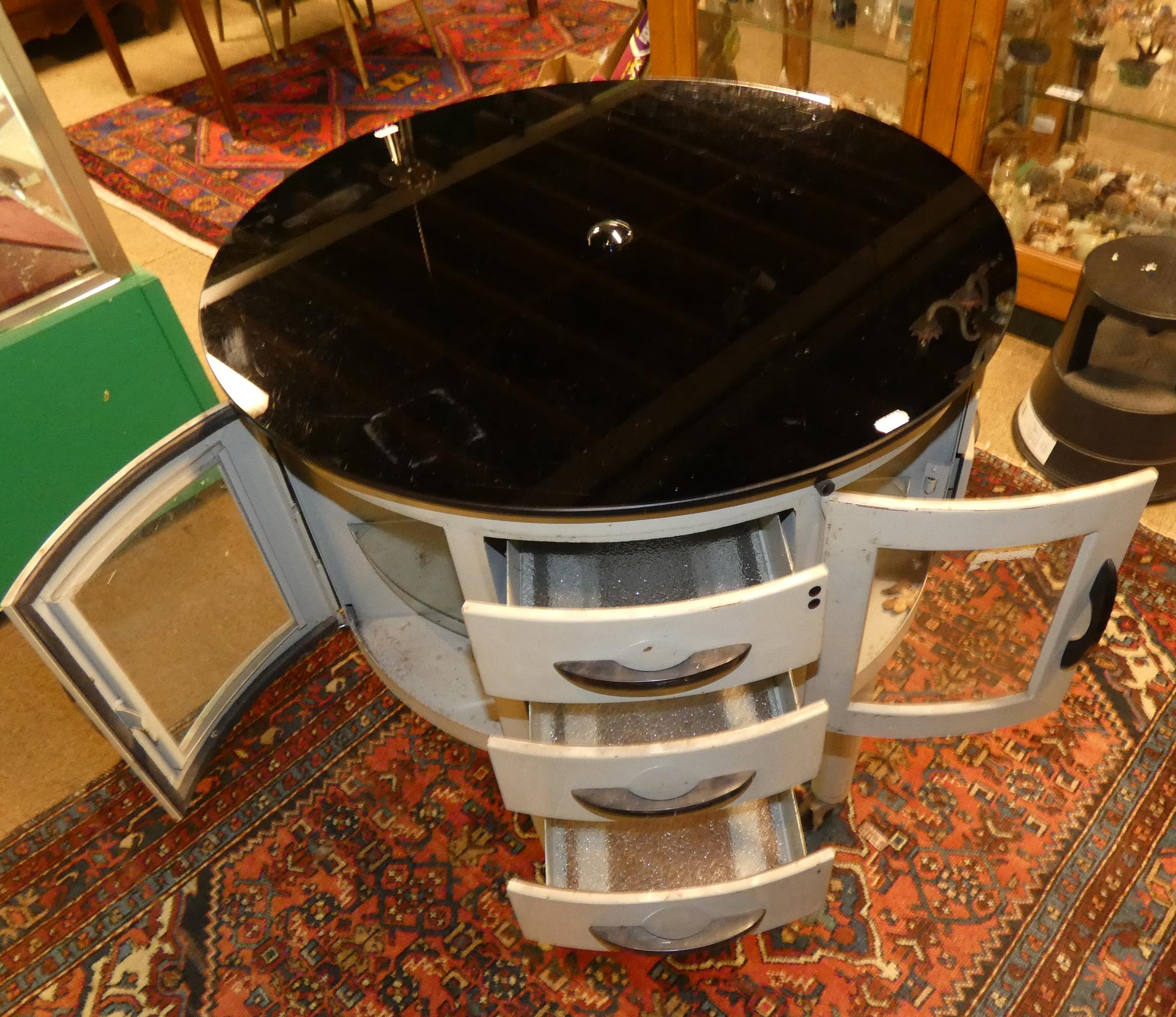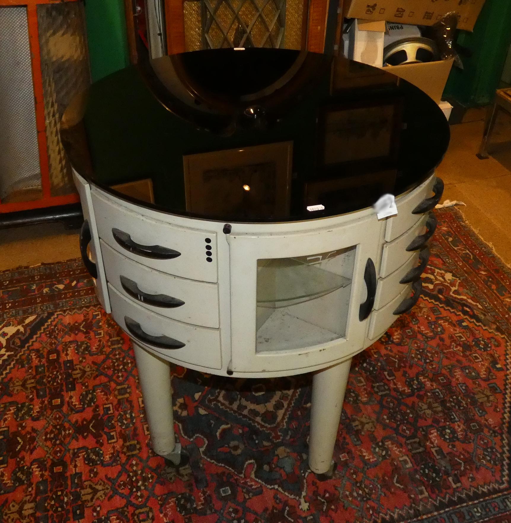 Meuble de dentiste modèle GIRATOR LEON MARTIN en métal laqué et verre (bel état gen, usure d'usage) 4 portes 14 tiroirs, 4 pieds sur roulettes H:89cm Diam:71cm