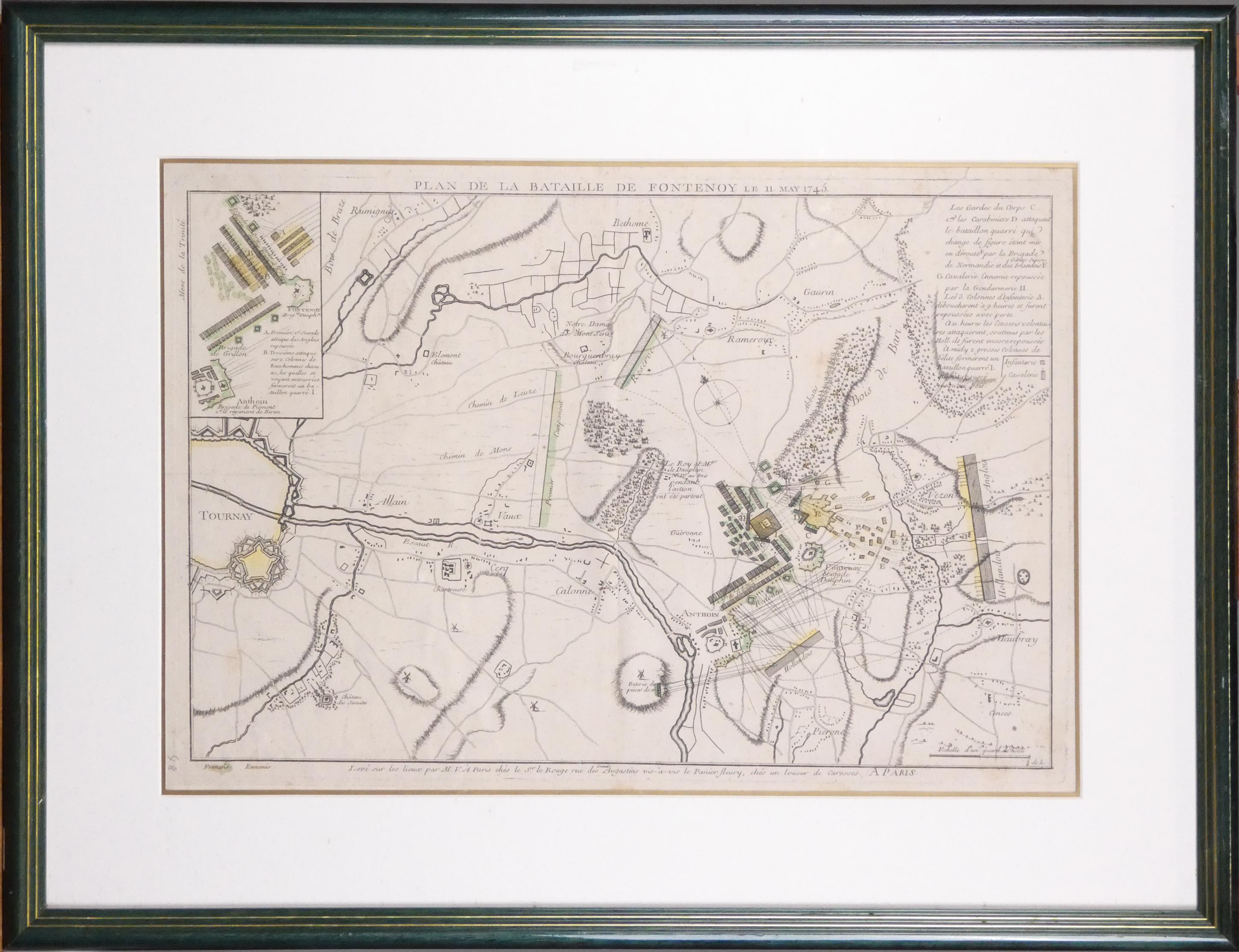 Estampe: Eau-forte Plan de la Bataille de FONTENOY le 11 May 1745 Levé sur les lieux par M.V à Paris 32,5x47,5cm cadre moderne sous verre