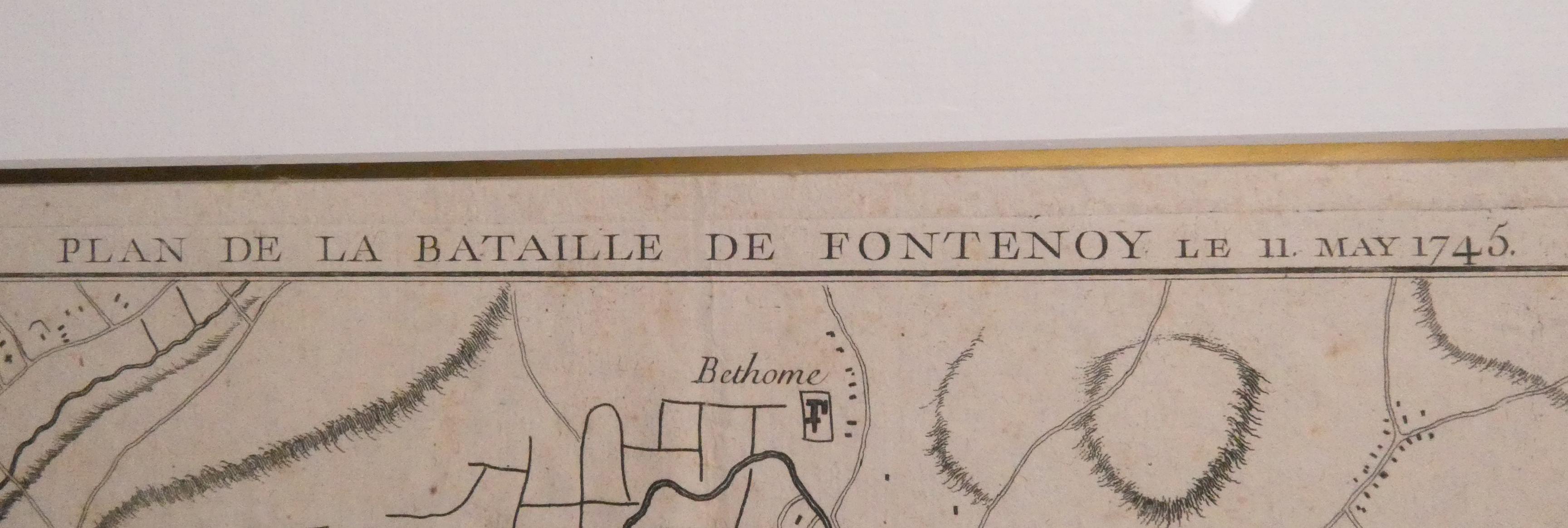 Estampe : Eau - forte Plan de la Bataille de FONTENOY le 11 May 1745 Levé sur les lieux par M.V à Paris 32 , 5x47 , 5cm cadre moderne sous verre