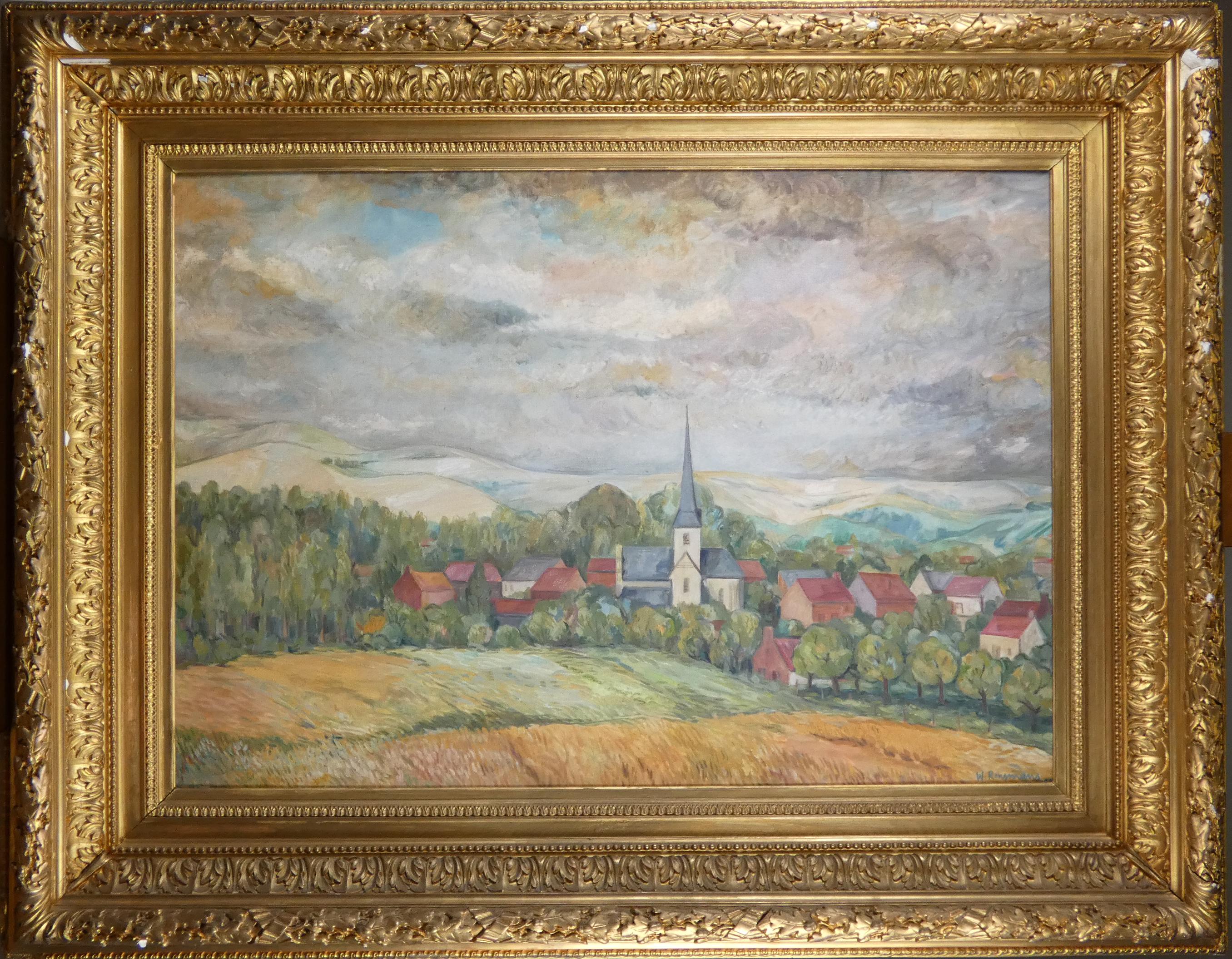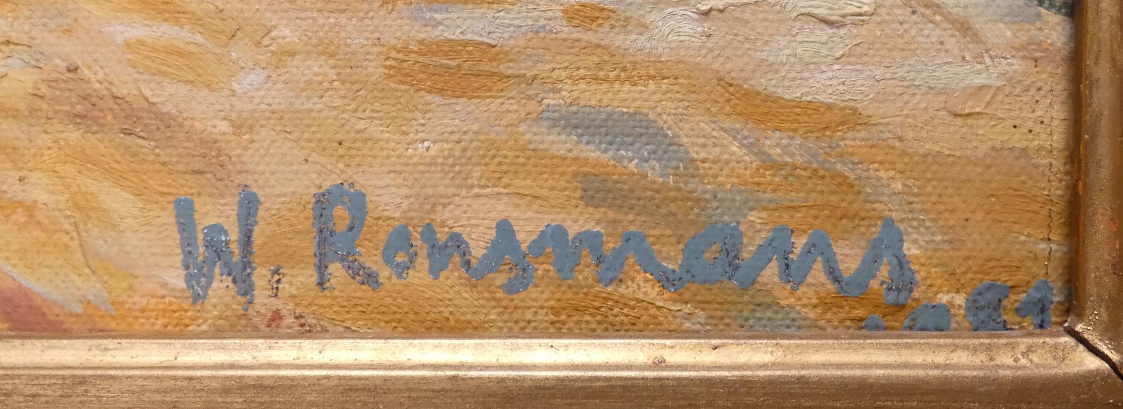 Tableau HST -Village en campagne- daté 1981 signé *RONSMANS W.* (Willy) (1935, ?) 67x95cm cadre doré de style (pt lacunes)