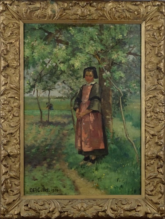 Tableau HST -Jeune fille au verger- 1902 signé *COTTET C.* (Charles) (1863, 1925) 54x37cm cadre de style doré