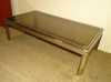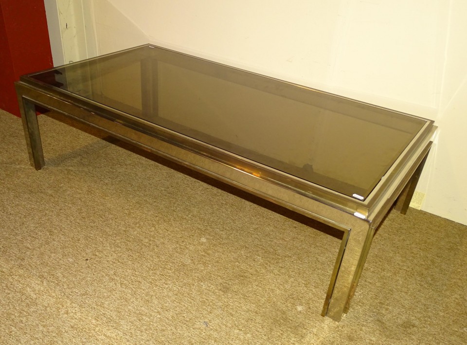 Meuble: table de salon rectangulaire vintage en métal chromé, doré et glace fumé