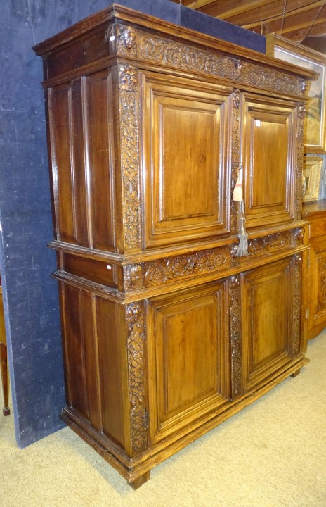 Meuble Deux corps 4 panneaux en bois sculpté Espagne 18eS (ds l'état) 201x158x64cm 2T