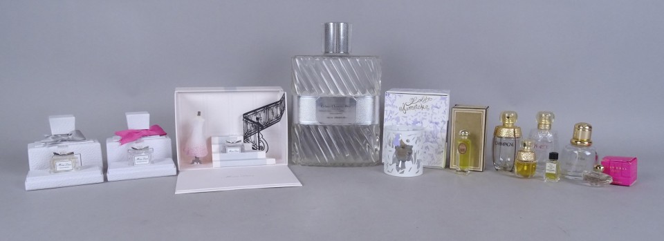 Collection: (12) flacons de parfum: Y.SAINT LAURENT Yvressse/Champagne/..., CHANEL mini, DIOR Miss Dior (écrin coffret)/ Sauvage factice, HERMES, L.LEMPICKA coffret