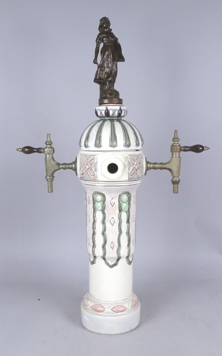 Céramique Pompe à bière en faïence majolique sommé d'un régule circa 1900