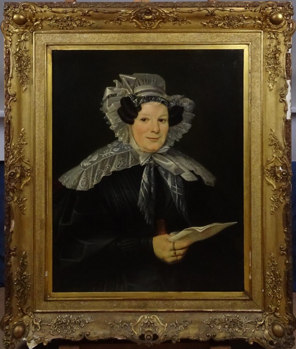 Tableau HST doublé -Portrait de dame Debacker- daté 1837 anonyme école Belge 78x62cm cadre de style doré (pt acc)