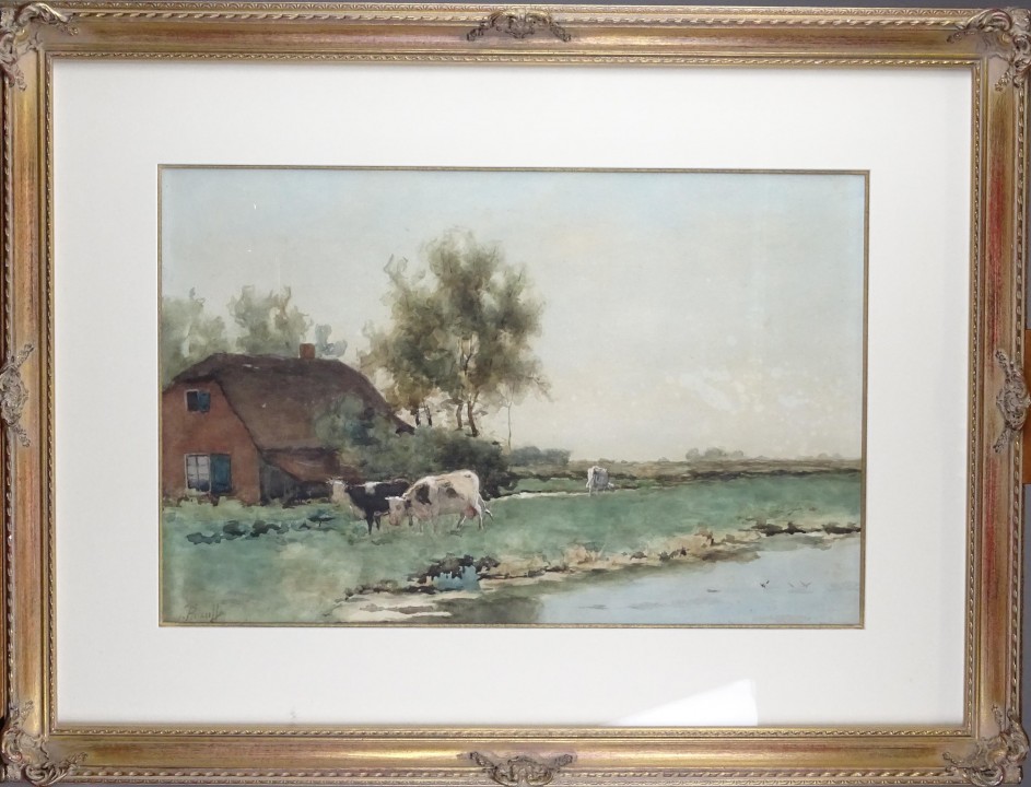 Tableau: dessin aquarelle -Paysage avec vaches- signé *BAUFFE V.* (Victor) (1849, 1921) cadre de style s/v