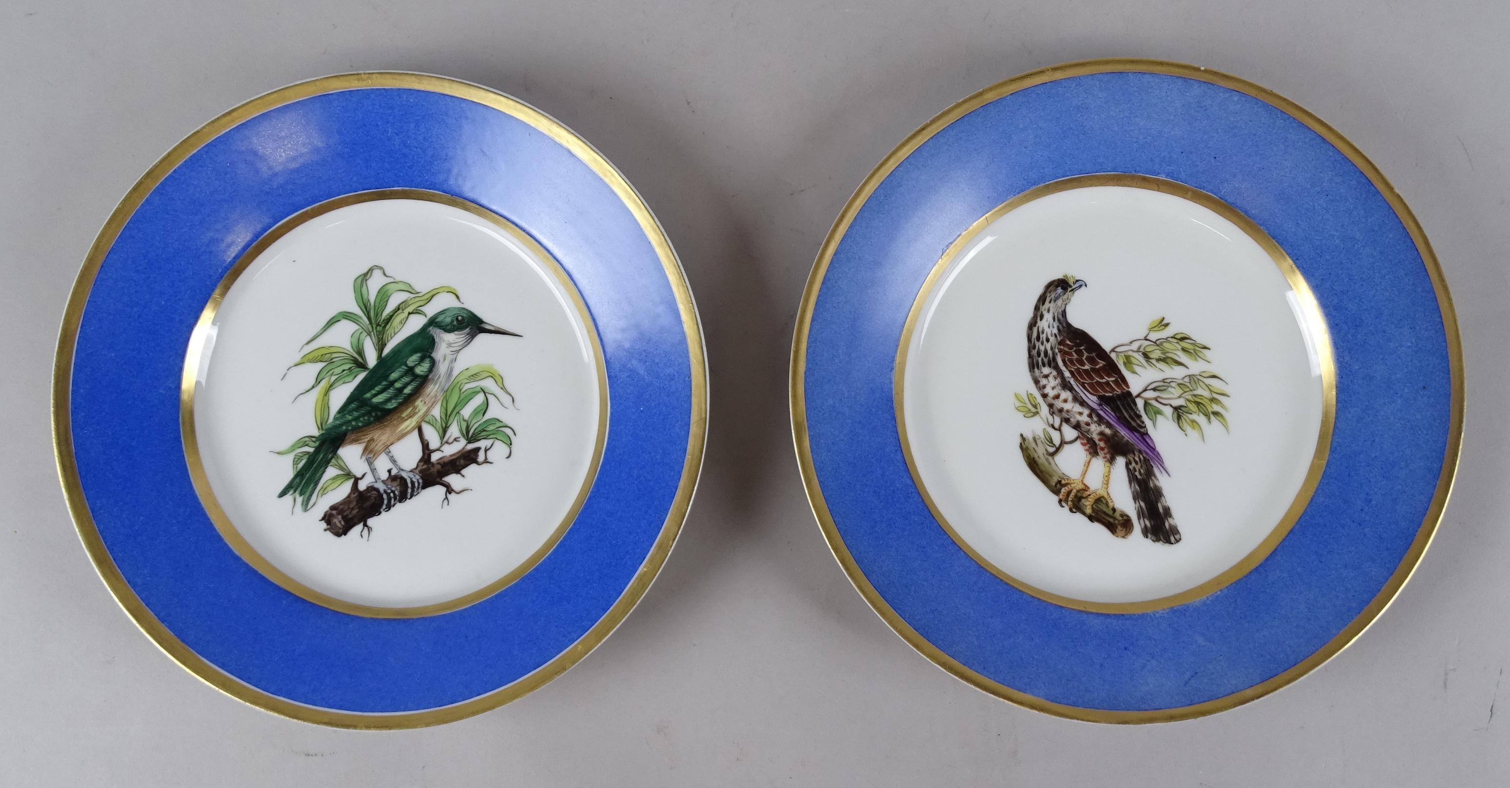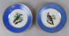 Céramique: 2 assiettes en porcelaine (écl dos) attribué à Vermeren Coché à Bruxelles décor aux oiseaux aile fond bleu rehauts d'or diam:23cm