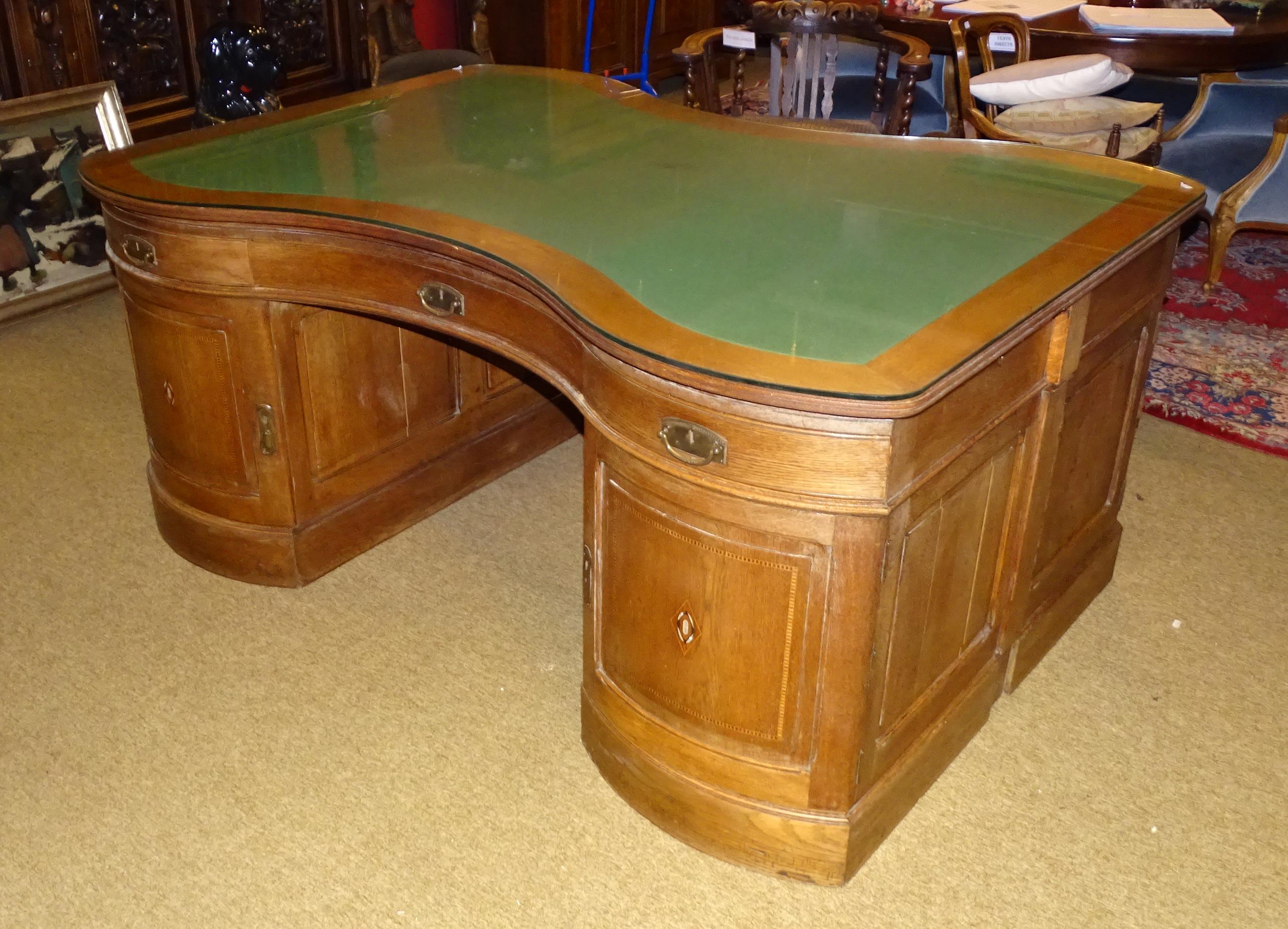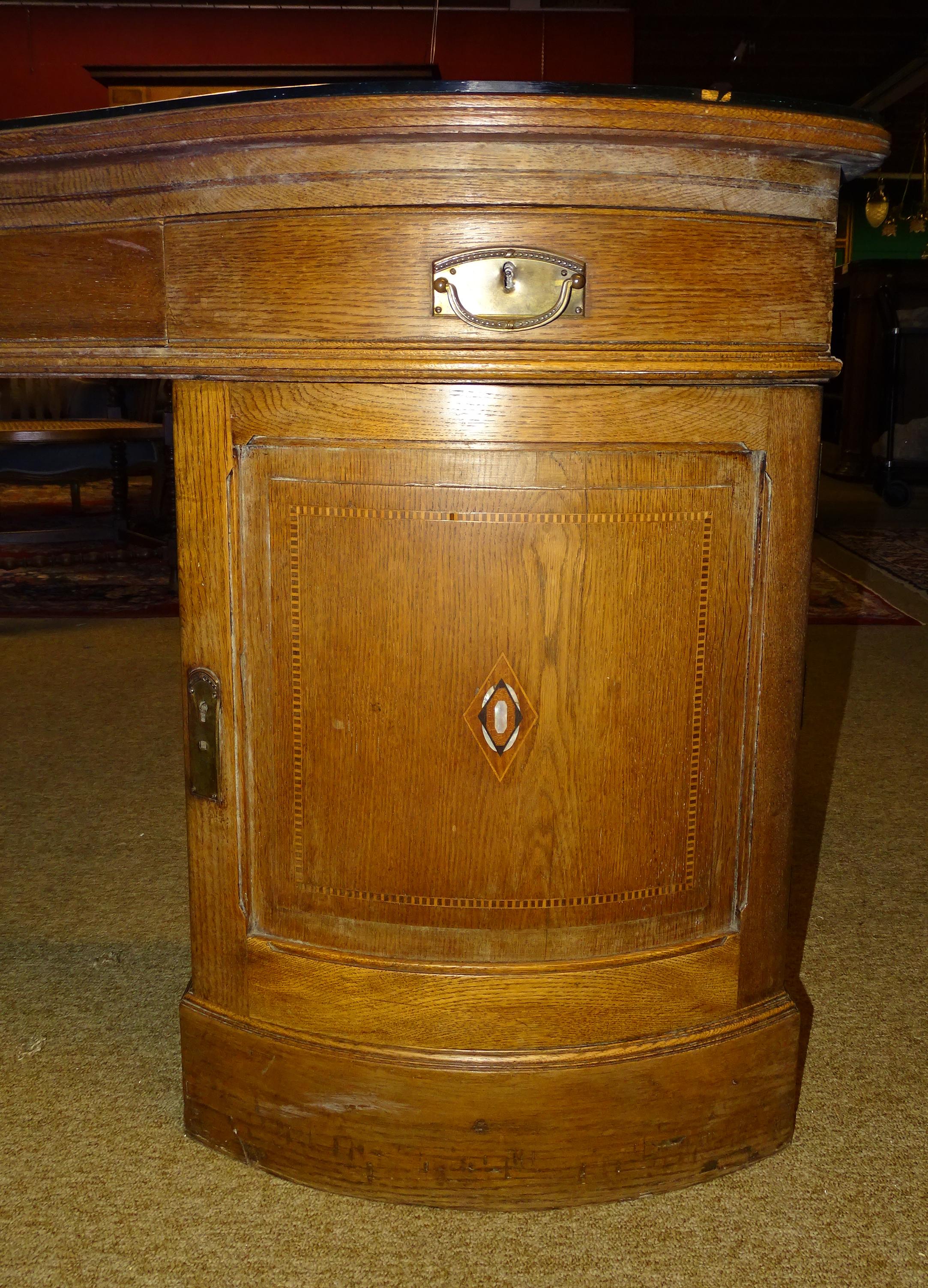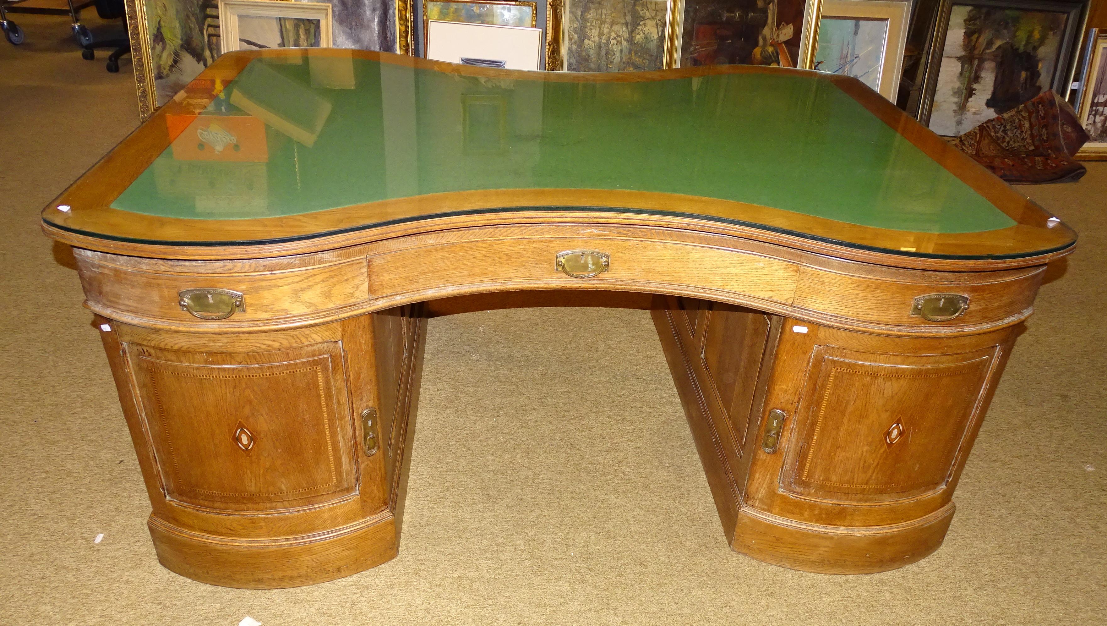 Meuble: Bureau double face/ notaire galbé ARTS and CRAFTS en chêne (mq) vers 1910 dessus verre (1ecl) 3T 2Px2 incrust. nacre filet de marqueterie 80x179x127cm expert Noel HOSTENS